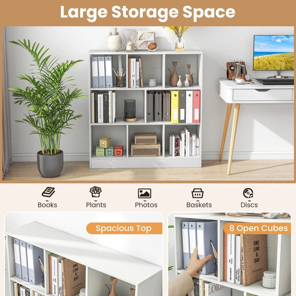 Featuring 3-tier open storage and a spacious top, it offers ample space to display books, photos, and potted plants, or to store various personal items. Crafted from premium engineered wood and MDF, it ensures exceptional durability and sturdiness, capable of holding up to 160 kg. The anti-topping kits and stable floor standing base also make it safe and reliable to use. This versatile wood display shelf can not only be used as a bookcase but also as a storage shelf or a toy cabinet, suitable for various settings. Elevate your space with this 3-tier bookcase. Bullet Point: 8 Open Compartments: This 3-tier bookshelf features 8 open cubes (2 large and 6 small cubes), plus a spacious top, offering convenient organization and easy access. Moreover, the varying sizes of the cubes also allow you to effectively display your books, toys, decorations, storage baskets, etc. Reliable Construction: Crafted from thickened engineered board and premium MDF, our freestanding storage organizer is capable of supporting a total weight of up to 160 kg, allowing it to handle a variety of items from your household. The elevated base also enhances the overall stability. Enhanced Security and Stability: The bookshelf includes 2 anti-topping kits to prevent it from wobbling or tipping over, making it safe for family environments. Additionally, it is equipped with back reinforced buckles that securely fix the back panel to the frame, providing greater stability and strength. Versatile Applications: Our wood display shelf serves multiple uses: as a bookcase, a storage shelf, or a toy cabinet. Its modern design fits seamlessly in various rooms including the living room, bedroom, kid’s room, or office, offering functional style wherever placed. Simple Assembly and Care: With straightforward instructions and all necessary accessories included, this open bookcase ensures effortless assembly. Additionally, the smooth surface is easy to clean, helping save time on daily maintenance. Features: 8 open cubes provide convenient organization and easy access to items Constructed from thickened board for reliable use 2 anti-tipping kits prevent from wobbling or tipping over Back reinforced buckles provide greater stability Non-slip foot pads protect the floor from scratches Smooth surface and elevated base for easy maintenance Modern design fits seamlessly into kid’s room, living room, bedroom, etc. Serves as bookshelf, display stand, storage shelf or toy cabinet