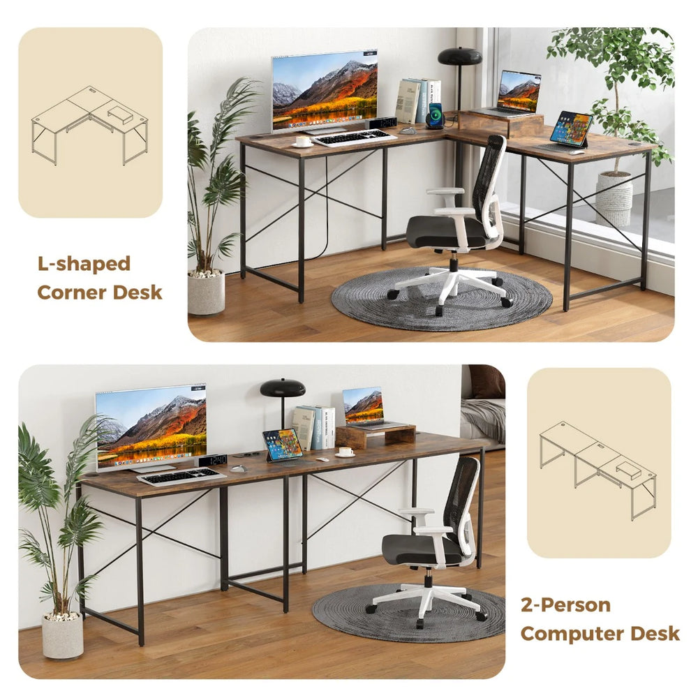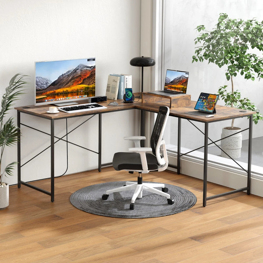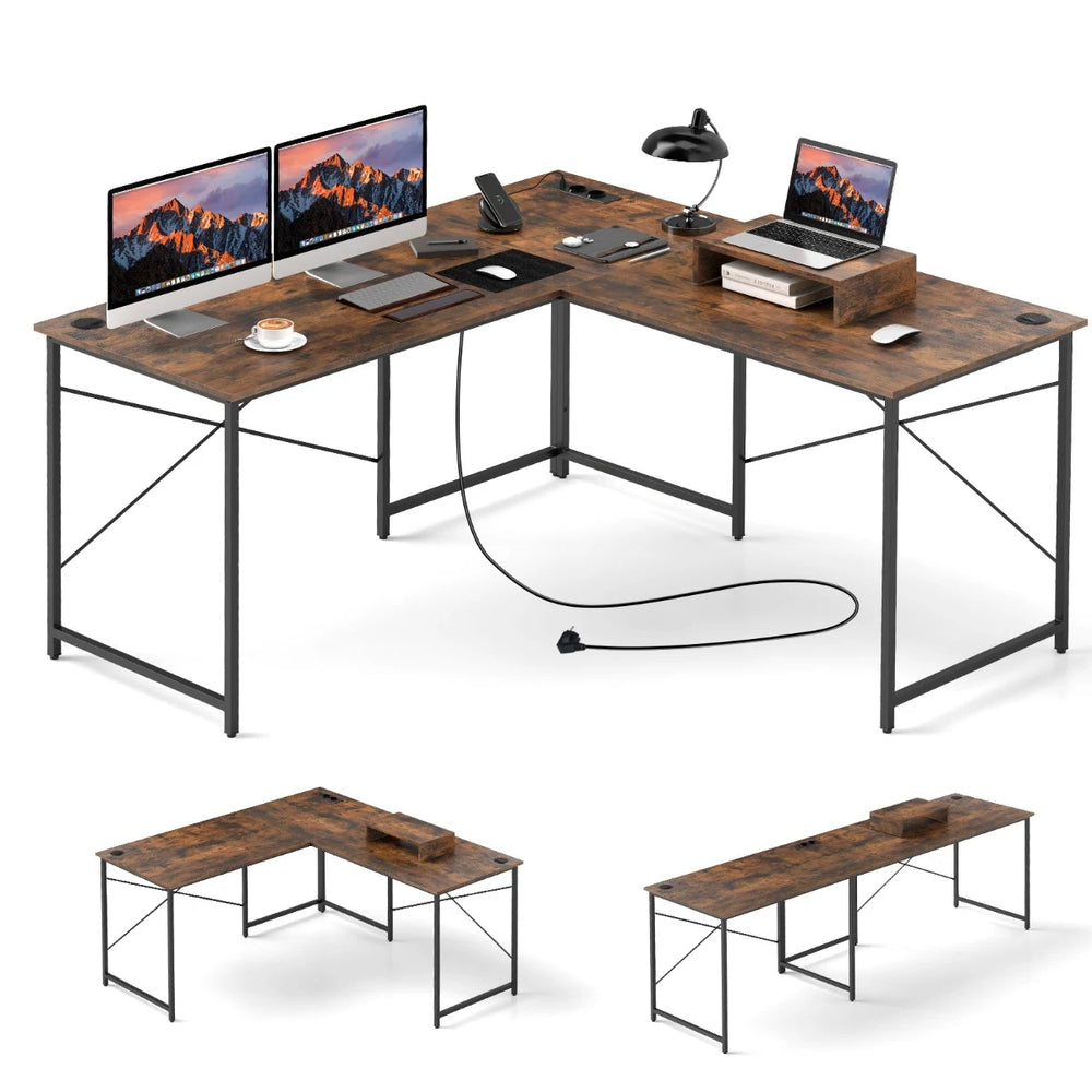 Reversible L-Shaped Desk with Built-in Power Strip and Removable Host Stand-Brown