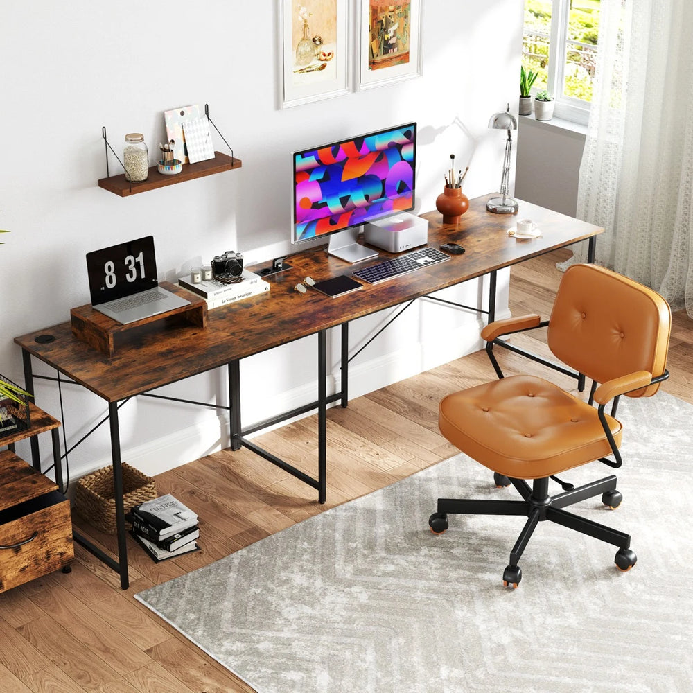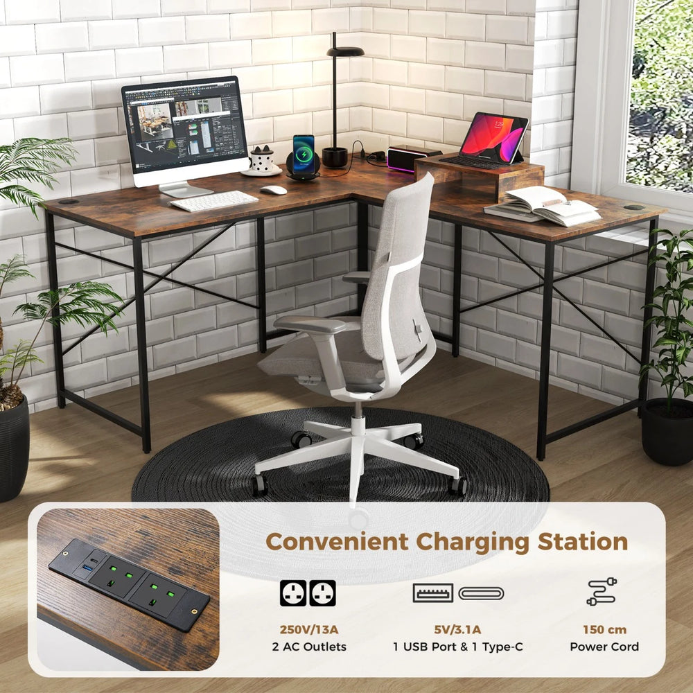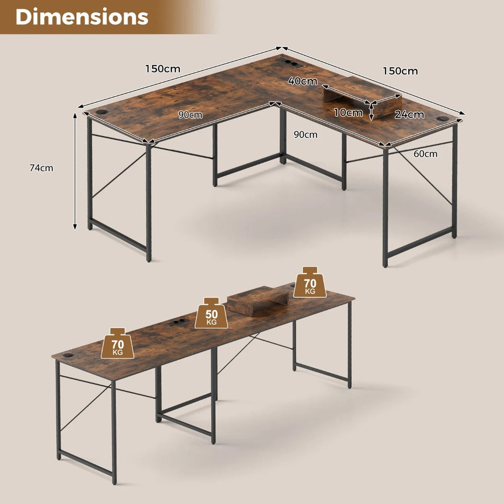 Colour: Rustic Brown/Natural Materials: Engineered Board, Metal Dimensions of L-Shaped Desk: 150 x 150 x 74 cm (L x W x H) Dimensions of Straight Desk: 240 x 60 x 74 cm (L x W x H) Dimensions of Host Stand: 40 x 24 x 10 cm (L x W x H) Weight Capacity of Desktop: 100 kg Weight Capacity of Host Stand: 15 kg 2 AC Outlets: 250V/13A 1 USB Port & 1 Type-C: 5V/3.1A Power Cord Length: 150 cm Net Weight: 24.5 kg Package Includes 1 x L-Shaped Computer Desk 1 x Instruction Manual