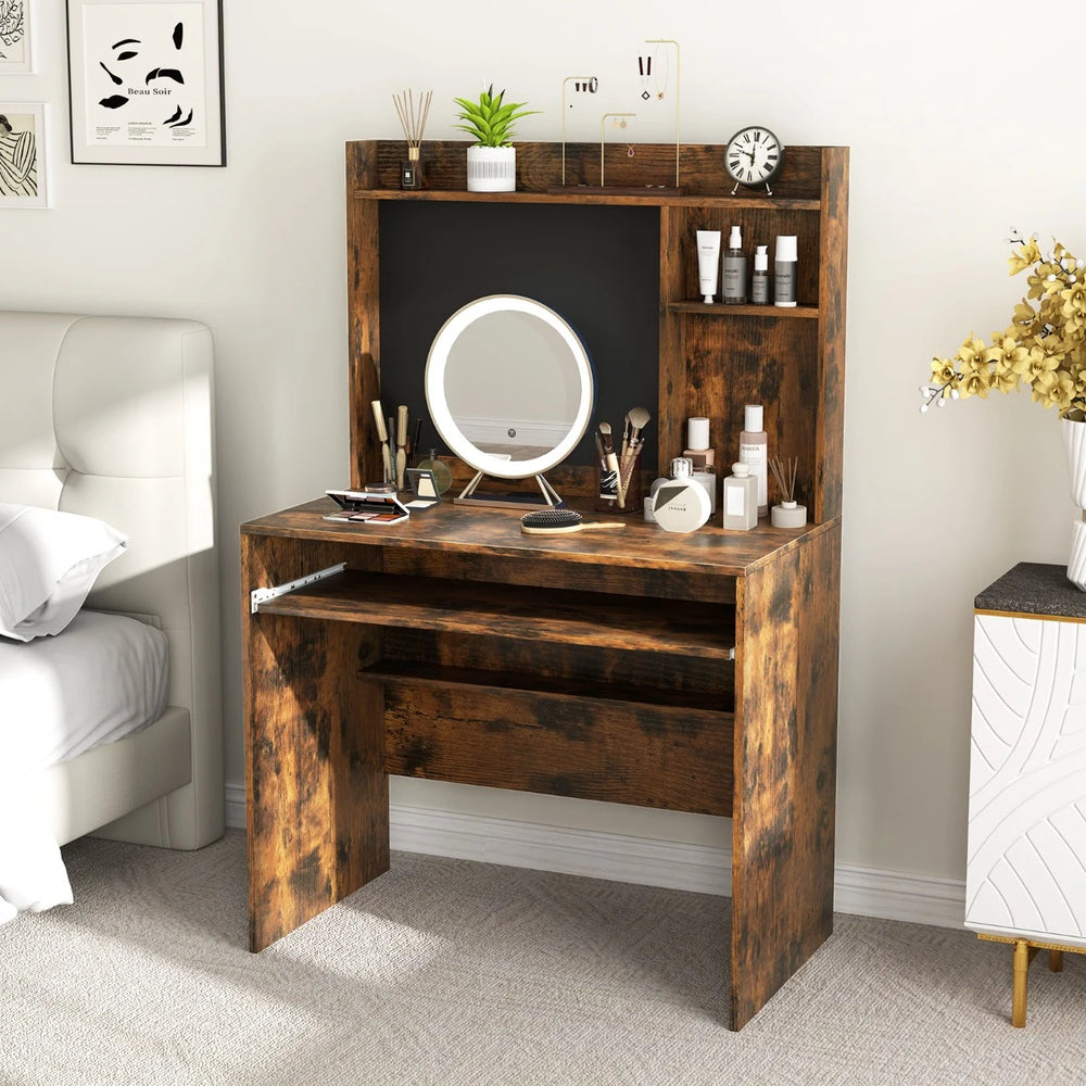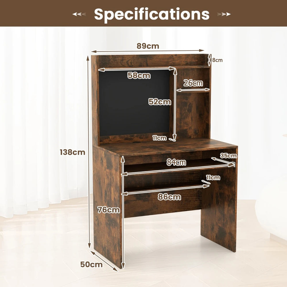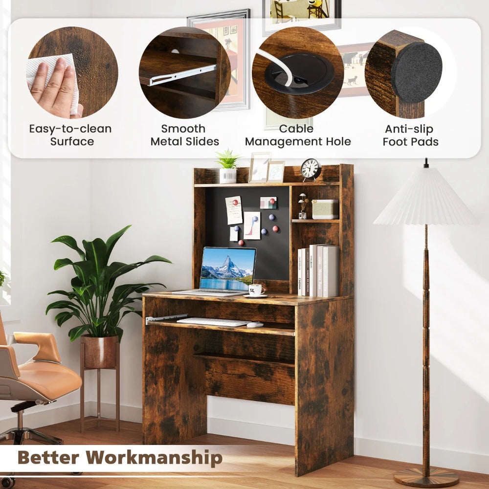 Upgrade your workspace to new heights of efficiency and organization with this premium computer desk. Featuring ample storage space with a hutch and bottom shelf, this desk ensures all your office essentials are within reach yet neatly stored away. The innovative magnetic bulletin board on the back panel provides a convenient solution for displaying notes, stationery, or cosmetics. Crafted from thickened board, this desk offers superior stability and security, incorporating two anti-tipping devices for a safe and worry-free work environment. The ergonomic design includes a retractable keyboard tray, promoting correct posture and reducing strain on your spine during long working hours. This desk's versatile appeal makes it perfect for various settings, from bedrooms to home offices, serving as a stylish computer desk, vanity table, or study desk. Bullet Point: Sufficient Storage Space: Maximize your workspace efficiency with this computer desk featuring extra storage space in the form of a hutch and bottom shelf. Moreover, the 5-position adjustable shelf on the side can keep your office essentials neatly organized and within reach, ensuring a clutter-free work environment. Magnetic Bulletin Board: The desk's back panel is designed with a magnetic surface, allowing you to easily attach notes, stationery, or cosmetics, keeping your desktop clutter-free and organized. Say goodbye to lost notes or misplaced items, as the magnetic board provides a convenient and visible space for all your essentials. Superior Stability and Higher Security: Constructed from thickened board, this study desk guarantees superior stability. Focus on your work without distractions, thanks to the inclusion of two anti-tipping devices that offer a sturdy and secure work environment, giving you peace of mind. Ergonomic Keyboard Tray: This desk features a retractable keyboard tray designed ergonomically to expand workspace and promote correct typing posture, reducing strain on your spine from prolonged work. Moreover, thanks to the smooth metal slides, you can easily pull the keyboard tray out. Suitable for a Variety of Settings: With a stylish and modern design, this desk is suitable for bedrooms, studies, and more. Transform your space with a versatile piece that can serve as a functional computer desk, elegant vanity table, efficient home office desk, or practical study desk, adapting to your diverse needs and spaces.
