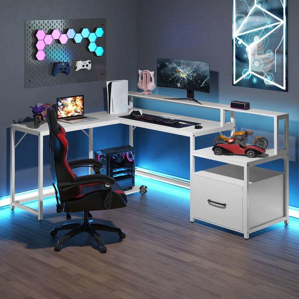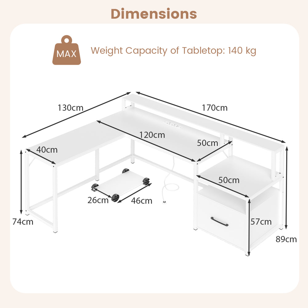 Colour: White Material: Engineered Wood, Metal Overall Dimensions: 170 x 130 x 89 cm (L x W x H) Tabletop Height: 74 cm Dimensions of Monitor Shelf: 170 x 15 cm (L x W) Dimensions of Pinter Stand: 50 x 50 x 57 cm (L x W x H) Dimensions of CPU Stand: 46 x 26 cm (L x W) Power Cord Length: 150 cm AC Outlet: 250V/13A USB Port: 12V/1.5A Type-C Port: 12V/1.7A Weight Capacity of Tabletop: 140 kg Weight Capacity of Monitor Shelf: 20 kg Weight Capacity of Printer Stand: 30 kg Weight Capacity of Drawer: 20 kg Weight Capacity of CPU Stand: 20 kg Net Weight: 36.5 kg Box QTY: 1(May vary by batch) Package Includes: 1 x L-shaped Desk 1 x CPU Stand 1 x User Manual