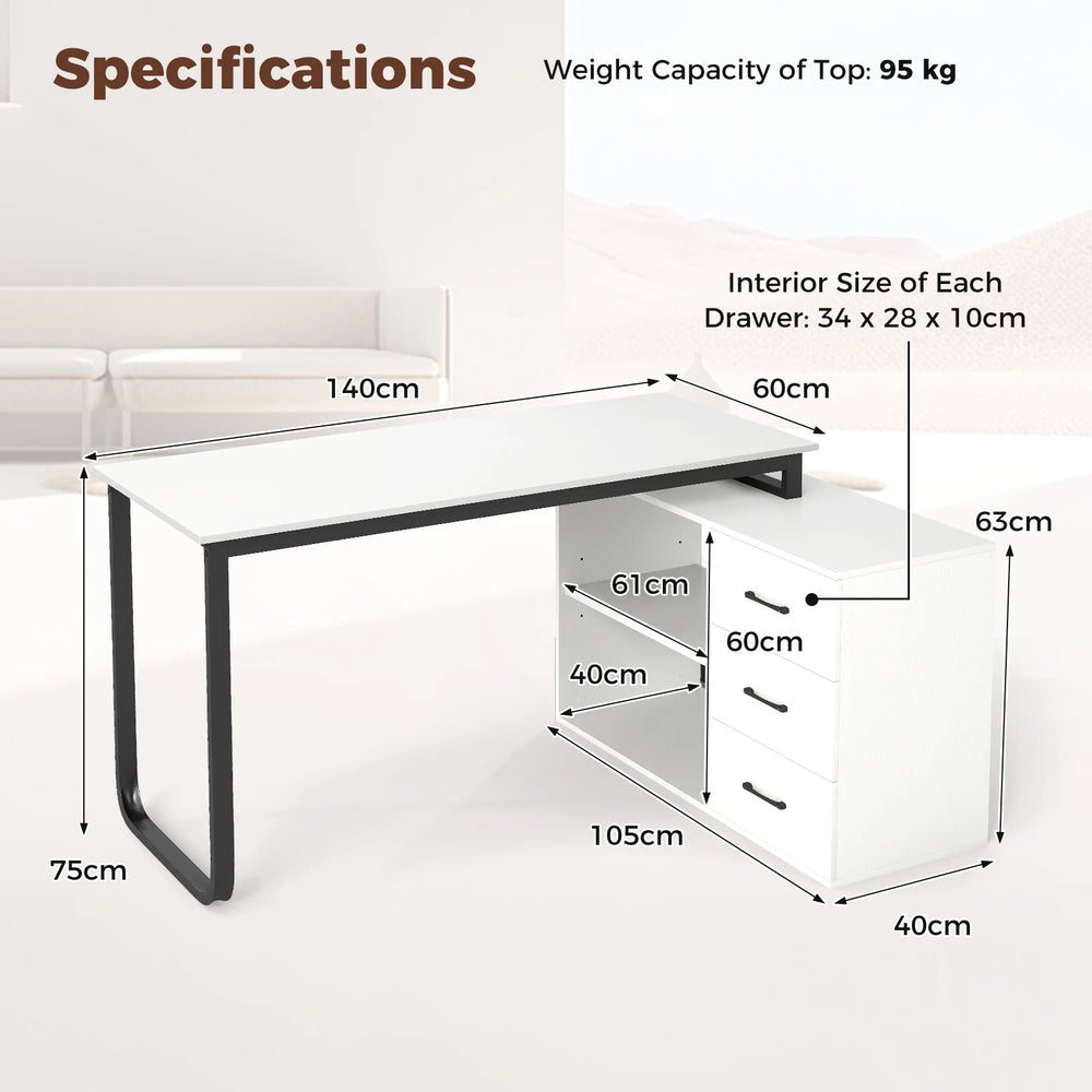 Colour: White Material: Engineered Wood, MDF, Metal Overall Dimensions: 140 x 105 x 75 cm (L x W x H) Size of Tabletop: 60 x 140 cm (L x W ) Size of Side Cabinet: 105 x 40 x 63 cm (L x W x H) Size of the Open Shelf: 61 x 40 x 60 cm (L x W x H) Interior Size of Each Drawer: 34 x 28 x 10cm (L x W x H) Load Capacity of Tabletop: 95 kg Net Weight: 40kg Box QTY: 2(May vary by batch) Package Includes: 1 x Computer Desk 1 x Instruction Manual