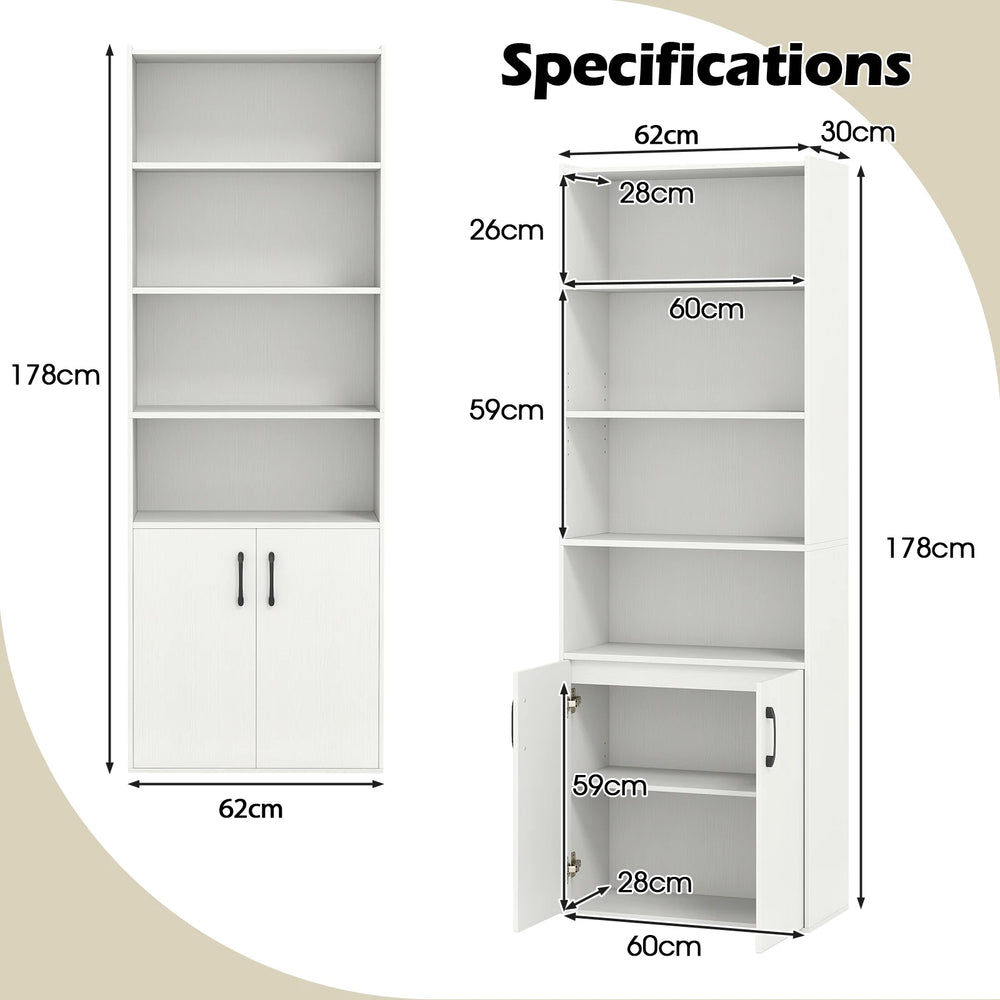Colour: White, Black Material: Engineered Wood, MDF Overall Dimensions: 62 x 30 x 178 cm (L x W x H) Open Shelf Dimensions: 60 x 28 x 26 cm (L x W x H) Adjustable Shelf Height: 59 cm Cabinet Interior Dimensions: 60 x 28 x 59 cm Weight Capacity in Total: 70 kg Net Weight: 26 kg Box QTY: 1(May vary by batch) Package Includes: 1 x Bookcase with Cabinet 1 x Instruction Manual