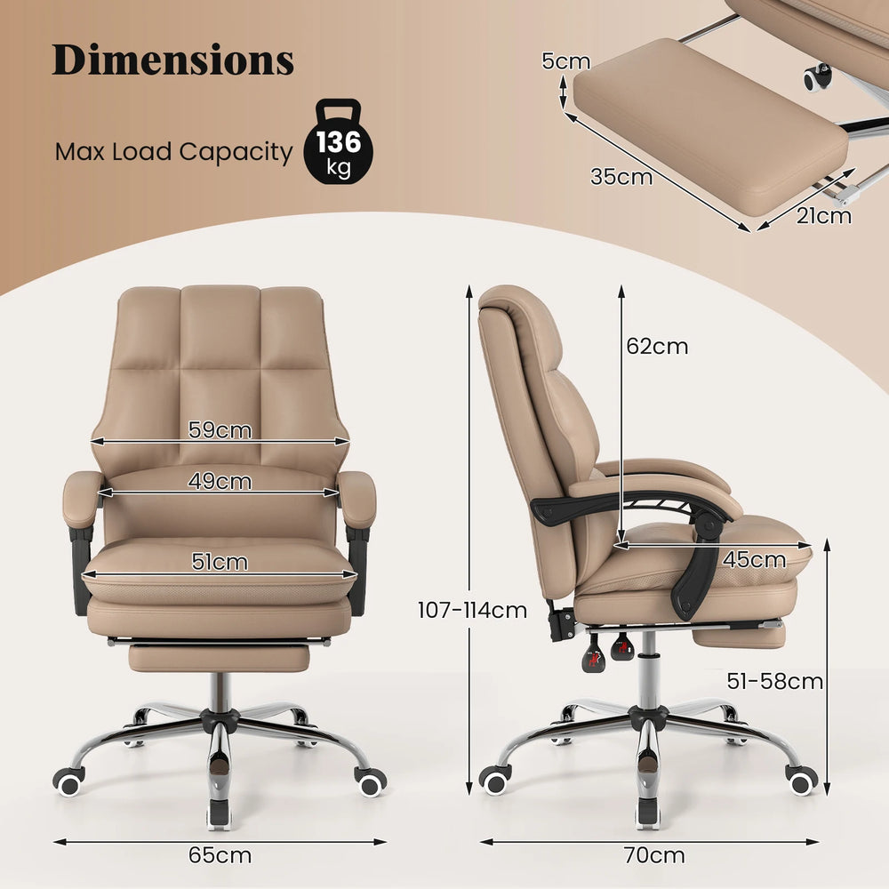 Technical data: Color: Coffee Material: PU, PVC, foam, plywood, metal Overall dimensions: 70 x 65 x 107-114 cm (L x W x H) Backrest dimensions: 59 x 62 cm (L x H) Inner distance between armrests: 49 cm Seat size: 51 x 45 cm (L x W) Seat height: 51-58 cm Footrest dimensions: 35 x 21 x 5 cm (L x W x H) Maximum load capacity: 136 kg Net weight: 18 kg Scope of delivery: 1 x office chair 1 x manual