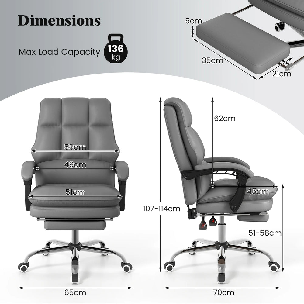 Colour: Grey Material: PU, PVC, Sponge, Plywood, Metal Overall Dimensions:70 x 65 x 107-114 cm (L x W x H) Size of Backrest: 59 x 62 cm (L x H) Inner Spacing of Armrests: 49 cm Size of Seat:51 x 45 cm (L x W) Height of Seat: 51-58 cm Size of Footrest: 35 x 21 x 5 cm (L x W x H) Max Load Capacity: 136 kg Net Weight: 18 kg Box QTY: 1 Package Includes: 1 x Office Chair 1 x User Guide