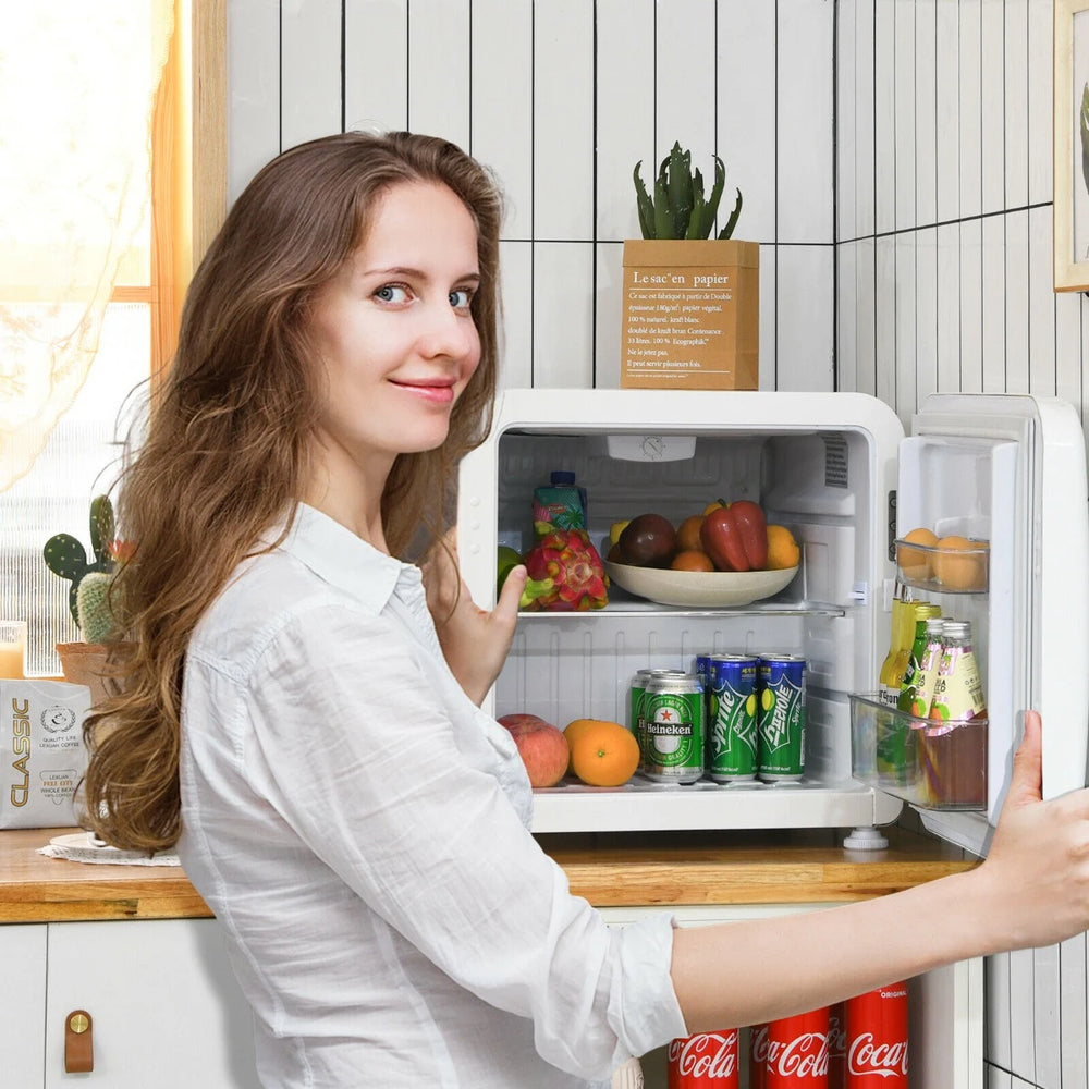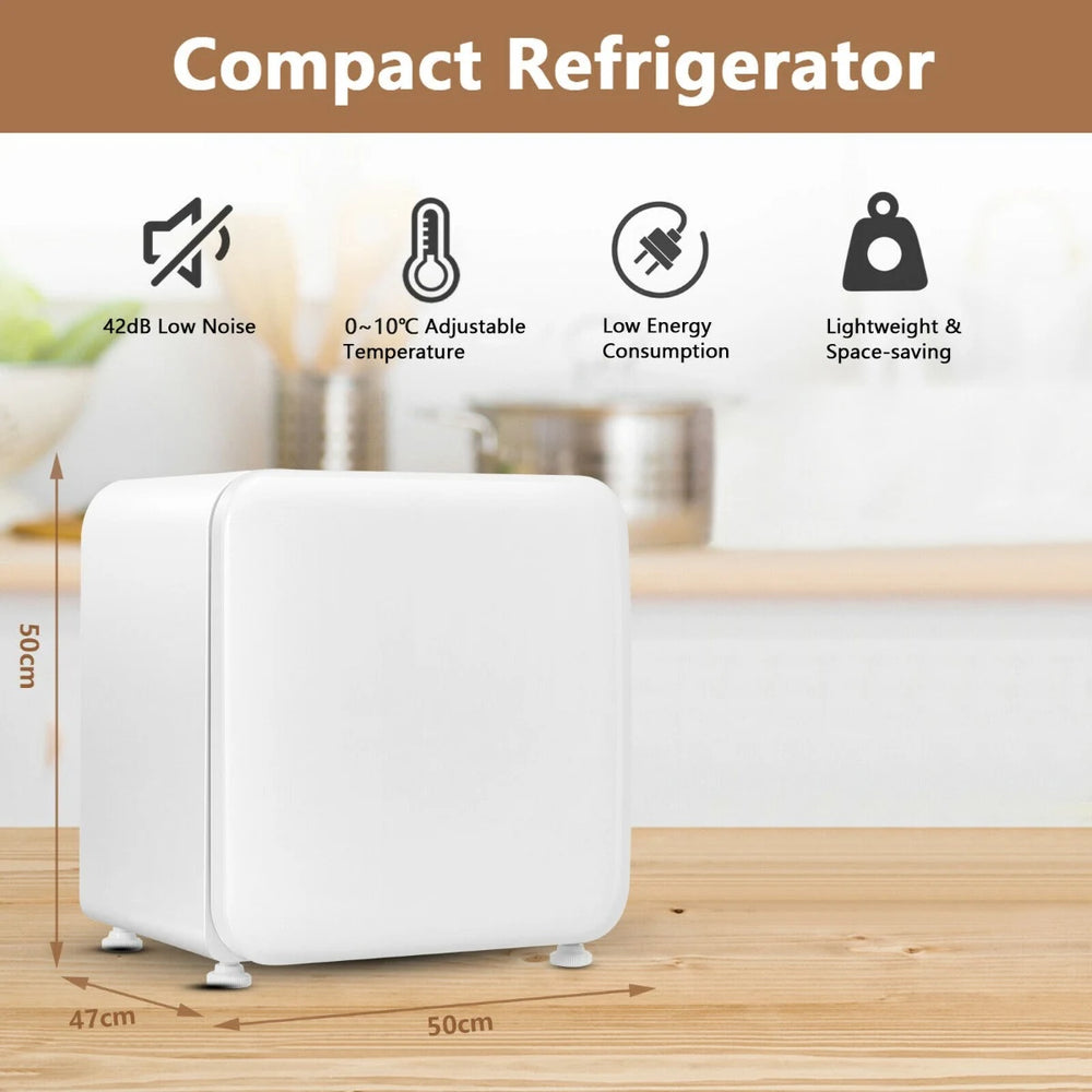 Colour: White Material: ABS Product dimension: 50 cm x 47 cm x 50 cm (L x W x H) Control method: Mechanical Voltage: 220-240 V/ 60 Hz Refrigerant: R600a/ 16g 0.5 g Cooling range: 0C~10C Noise level: 42 dB Net weight: 19 kg Package includes: 1 x Refrigerator 1 x Instruction manual