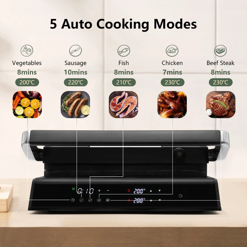 The smart LED touch control panel includes five automatic cooking presets for vegetables, sausages, fish, chicken and beef steak, plus a 0–4 hour timer and a clear preheat beep so you know when the plates are ready. Upper and lower grill plates have independent temperature adjustment (90°C–230°C) for flexible cooking styles.