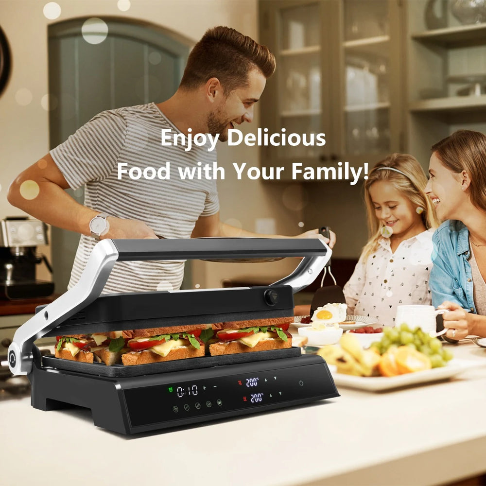 - Independent upper and lower temperature control (90°C–230°C) lets you sear one side while gently cooking the other — ideal for different foods and thicknesses.