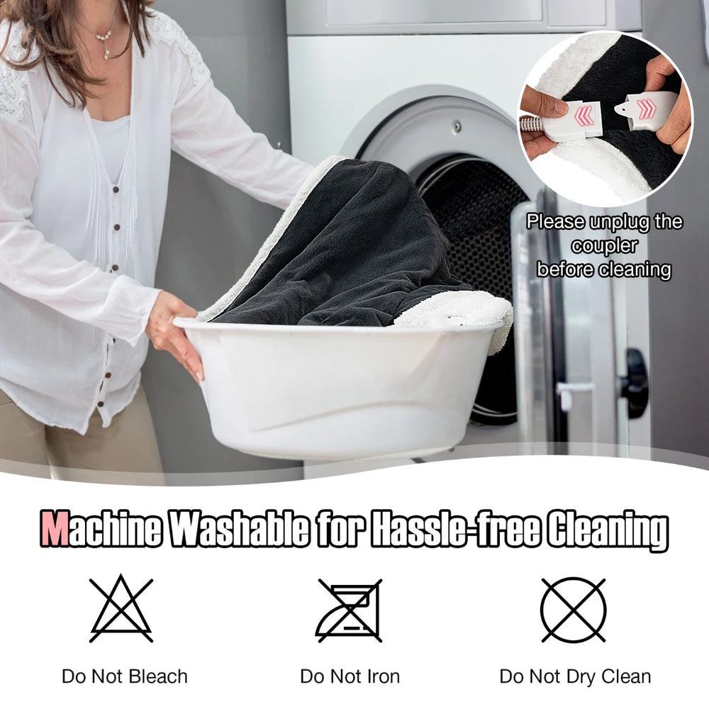 Care is simple — the blanket is machine and hand washable for easy maintenance. Do not dry clean, bleach or iron. Always remove the coupler and power supply before cleaning and follow the manufacturer instructions to keep the fibres soft and the heating elements reliable.
