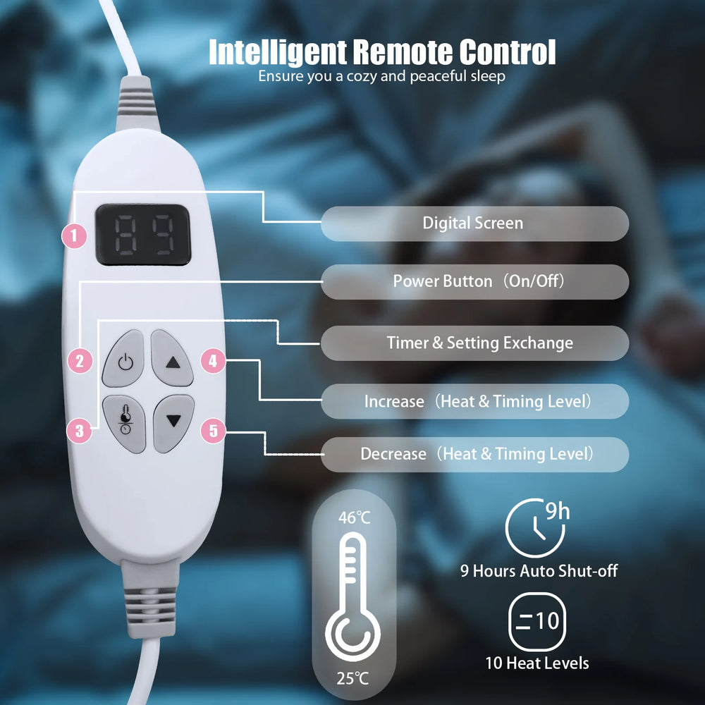 The electric blanket is definitely the ideal gift for yourself or your family in cold winter day. With the high quality PTC heater, you can be immediately wrapped in an even heat flow. An easy-to-use remote control enables 10 adjustable settings to meet different people's needs. In addition, the 9-hour automatic shut-off feature will improve your sleep efficiency. Besides, with overheat and overcurrent protection, you don't have to worry about safety with our heating blanket. What's more special is that this comfortable heating blanket can be used on both sides, one side is smooth and warm faux rabbit velvet, and the other side is light sherpa fleece. Whether in the bedroom, library or office, it will work well to make you feel warm. And this electric blanket can be hand-washed or machine-washed for easy maintenance. Safe First and Powerful Heater: Safety always comes first, our reversible electric blanket features overheat and overcurrent protection. On top of that, we have used a highly efficient PTC heater, which transfers heat to your whole body so you can feel the warmth faster and more evenly. Customize Your Desired Settings: Considering the needs of different people, our electric blanket can set the temperature from 25-46C in 10 levels. In addition, you can preset the auto shut-off time within 9 hours so that you can enjoy a sound sleep. And all the settings can be easily achieved by the smart controller. Dual-side Premium Material: One of the outstanding advantages of our heating blanket is that it uses different materials on both sides, one side is smooth and warm rabbit fleece, and the other side is comfortable and light sherpa fleece. The high quality material will bring you the ultimate luxury enjoyment. Warm-hearted Gifts: Thanks to its excellent heating effect, our electric blanket is friendly to people with cold hands and feet or the elderly. In addition, the concise appearance and comfortable material of our electric blankets will make them feel wrapped in clouds and enjoy a relaxing experience. Suitable for Various Scenes: Our heated reversible blanket is sure to keep you company through many cold winter days. Whether you read, work, study, watch TV or sleep, it will bring you instant warmth in your daily life. In addition this electric blanket can be machine washed and hand washed. Note: Please unplug the controller before washing.