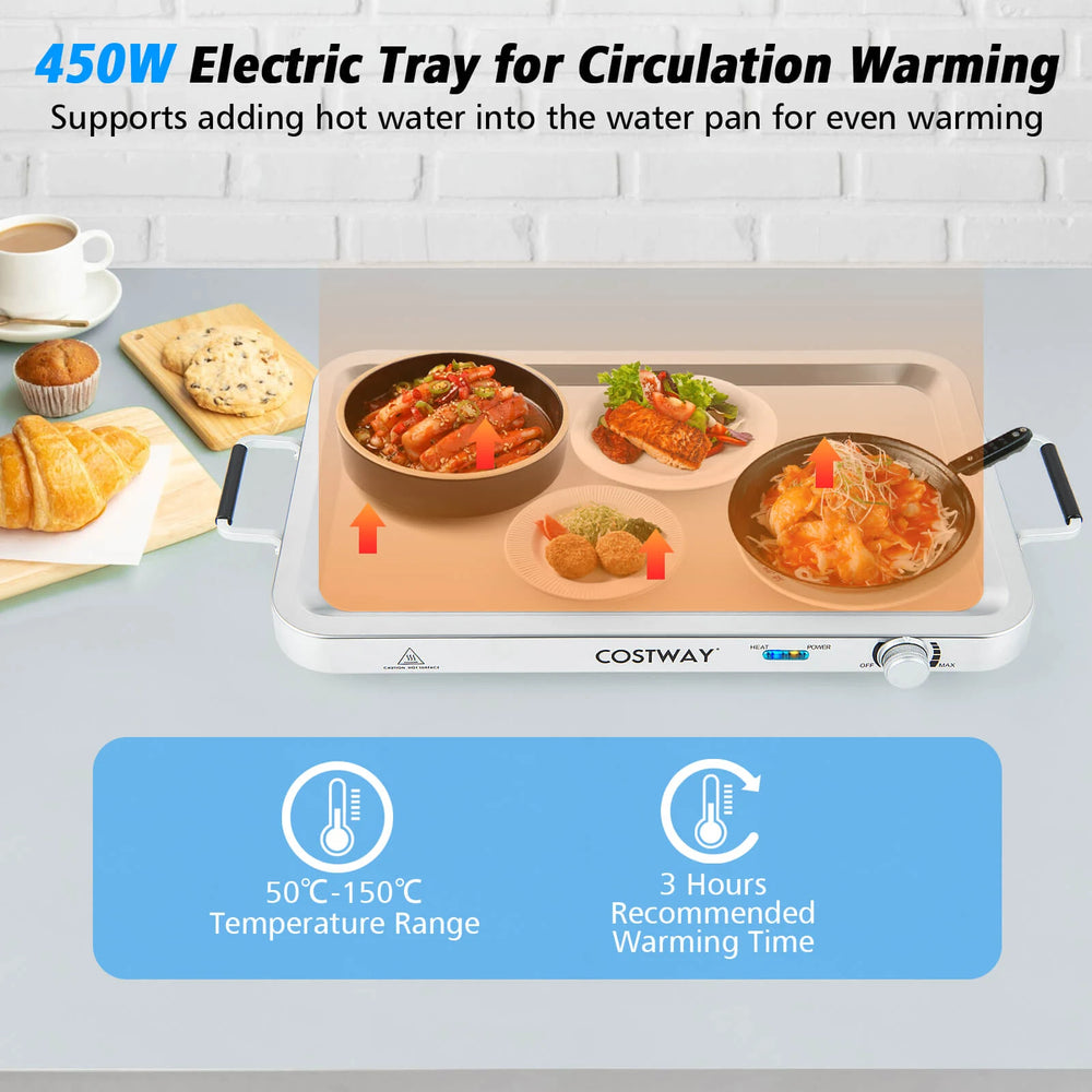 Look no further than this Electric Warming Tray, expertly crafted with a powerful 450W heating system that effortlessly maintains a consistent 150C temperature. Why settle for cold dishes when you can present your culinary creations on a multifunctional warming tray that accommodates all types of tableware, including glass, enamel, ceramic, aluminum, and stainless steel? Ever wondered how to keep a variety of dishes warm while also displaying them appealingly? This warming tray answers this with its sizable 7.5 L capacity across 3 stainless steel serving trays, complete with transparent lids and utensil slots. This durable warming tray ensures that post-event tidying is hassle-free, with dishwasher-safe trays and wipeable surfaces. Lastly, this thoughtful design includes non-slip foot pads, rounded corners, and convenient handles, which provide stability, safety, and ease of transport. If you are looking for such a product, do not hesitate to buy it! Easy Temperature Control: This electric warming tray boasts a temperature control knob and 450W power, securing a temperature range of 50C-150C to keep your delectable dishes at the perfect serving temperature. Whether its a bustling family get-together or an elegant buffet, this warming tray will provide consistent warmth to your culinary creations. Multifunctional Warming Tray: Place your own tableware on the large warming tray top to heat foods. The spacious warming surface accommodates various types of cookwares, including glass, enamel, ceramic, aluminum, and stainless steel, ensuring your table presentation is as diverse as your menu. Large Capacity and Visual Design: This warming dish boasts 3 premium stainless steel serving trays with a 7.5 L total capacity, perfect for hosting sizable feasts. The transparent lid allows you to clearly see the food inside, while the utensil slots are designed for easy spoon placement. Durable Material and Easy to Clean: Crafted from premium stainless steel, this enduring food warmer is designed for longevity. Cleaning is a breezesimply wipe the stainless steel surfaces, and the 3 serving trays are dishwasher safe. Note: Always make sure the appliance is off, unplugged from the electrical outlet, and completely cool before cleaning. More Thoughtful Details: The non-slip foot pads ensure stability during use, while round corners minimize accidental bumps. Besides, this electric warming tray also comes with convenient lid grips and side handles to offer you great convenience.