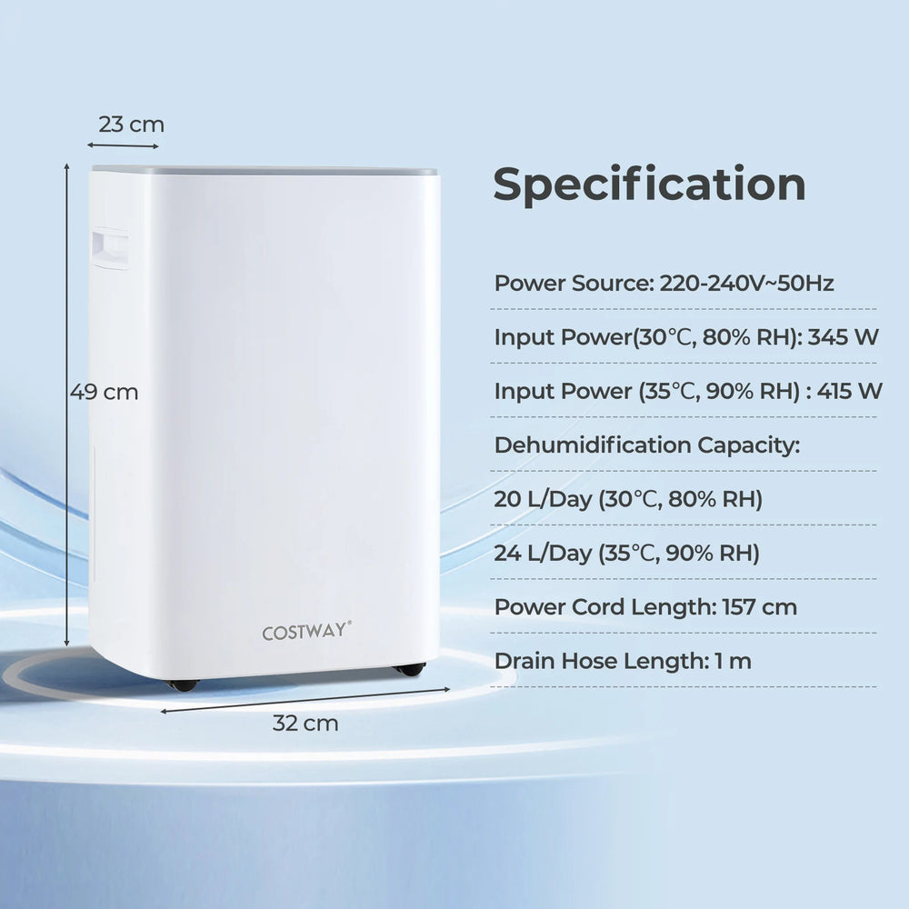 Colour: White Material: ABS Product Dimensions: 32 x 23 x 49 cm (L x W x H) Power Source: 220-240V~50Hz Input Power(30C, 80% RH): 345 W Input Power (35C, 90% RH) : 415 W Dehumidification Capacity: 20 L/Day (30C, 80% RH) 24 L/Day (35C, 90% RH) Humidity Setting Range: 30% - 80% Coverage Area: 30m2 Water Tank Capacity: 2.5 L Power Cord Length: 157 cm Drain Hose Length: 1 m Diameter of Drain Hose: 16 mm Net Weight: 13 kg Package Includes: 1x Dehumidifier 1x Drain Hose 1 x Instruction Manual