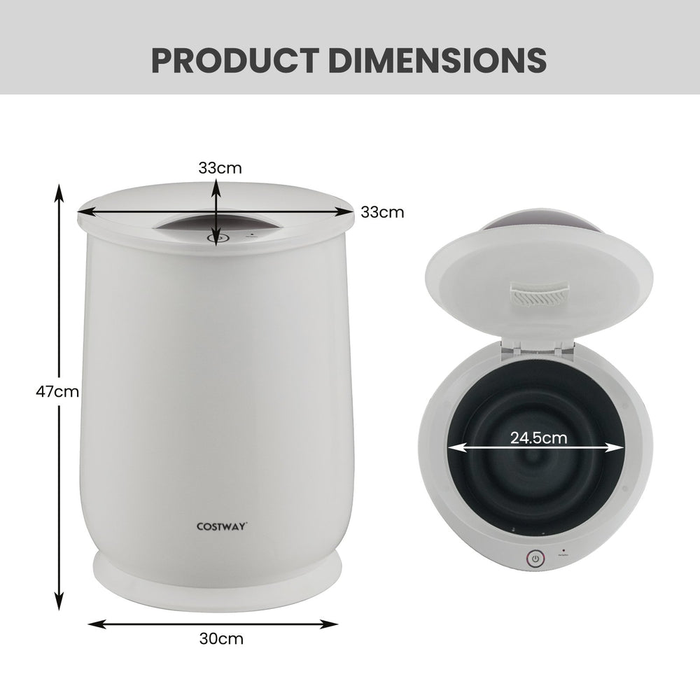 Enjoy a luxurious spa at home with this towel warmer bucket! This one-button control towel warmer is easy to use and can heat up quickly, reaching the highest temperature of 130C within 15 minutes. After heating for 60 minutes, the towel warmer bucket will shut off automatically, ensuring safety and saving energy. In addition, it warms up towels inside and outside evenly to bring you a comfy spa-like experience. The 21L extra-large towel warmer works for a whole familys warmth, which can easily hold up to two 115 x 180cm bath towels or a bathrobe, a personal blanket, stockings, pajamas, etc. Moreover, the freestanding bucket design and light weight make it easy to move around and can be placed anywhere. The round-shaped base is stylish and stable, while the flip-top lid design is easy to open and close. Bullet Point: Enjoy Comfy & Warm Towels: Featuring a galvanized sheet inner liner design with good thermal conductivity, this towel warmer bucket heats up instantly and reaches the highest temperature of 130C within 15 minutes. Besides, the heating wires have been added at the bottom, which warms up evenly and eliminates all cold spots to offer you warm towels after bathing or swimming. 21L Extra Large Capacity: This 21L large capacity bucket style towel warmer is designed to care for the whole family. It can accommodate 2 large bath towels (115 x 180cm), a bathrobe or a personal blanket. Moreover, the spa towel warmer can also work for baby clothes, underwear, pajamas, socks, etc. Simple Operation & Auto Shut Off: This towel warmer bucket is easy to use with single button control. A heating cycle lasts for 60 minutes and it will shut off automatically after the cycle is finished. So, there are no more worries about forgetting to turn off the towel warmer. Safe to Use & Thoughtful Design: When the interior surface of this bath towel warmer reaches 50C, the hot surface indicator will light up to remind you not to touch. The flip top design and convenient handle make it easier to open and close the lid. Additionally, double wall thermal insulation cover keeps a cool touch. Besides, build-in fragrance holder can add a fresh aroma to your towel. Ideal Gift for Family & Friends: This bathroom towel warmer is a great addition to your home or pool house, hair salon, hotel, spa, massage parlor, especially for the cold winter days. And it is also a perfect gift for housewarming, weddings, birthdays, anniversary and more. Featuring a lightweight design and compact size, it is easy to move the towel warmer from one place to another.