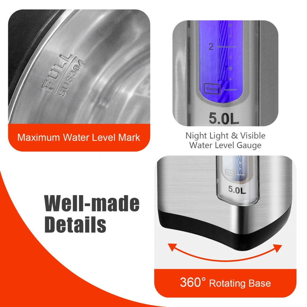 - Large 5 L capacity reduces refills and keeps a steady supply of hot water for families, offices and small gatherings.