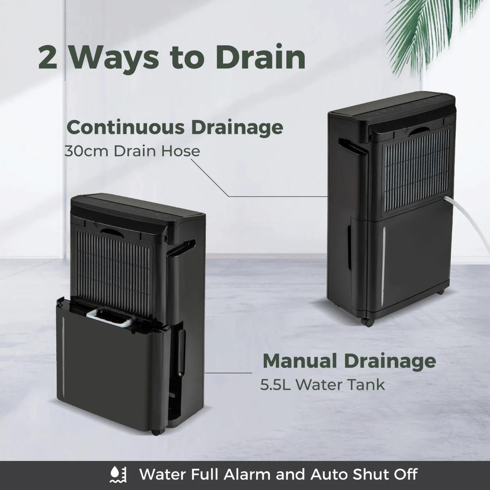 Colour: Black Material: ABS Product Dimensions: 35 x 20 x 61 cm (L x W x H) Voltage: 220-240V Frequency: 50Hz Rated Input Power: 440 W Rated Input Current: 2.2 A Dehumidification Capacity: 25 L/Day (30C, 80% RH) 13 L/Day (27C, 60% RH) Water Tank Capacity: 5.5 L Humidity Setting Range: 30% - 80% Coverage Area: 30m2 Drain Hose Length: 30 cm Power Cord Length: 190 cm Noise Level: 42 dB Net Weight: 13.5 kg Box QTY: 1(May vary by batch) Package Includes: 1 x Dehumidifier 1 x Drain Hose 1 x Instruction Manual