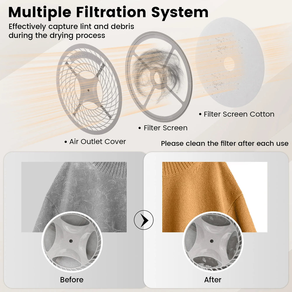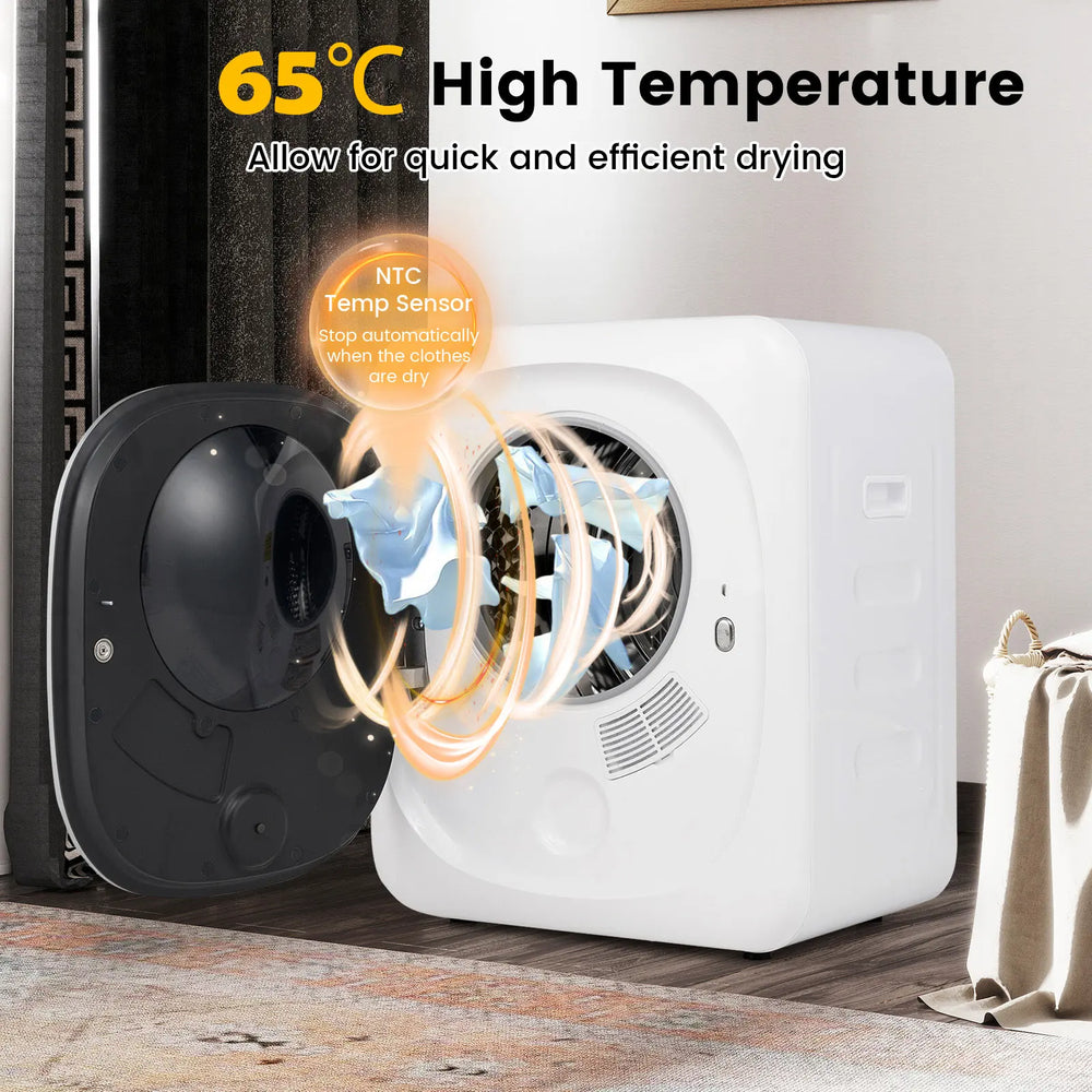 Transform your daily chores into a breeze with our portable clothes dryer, perfectly tailored for apartments, dorms and RVs. This electric dryer features an 800W engine for 69C high-temperature sanitization and incorporates a long-lasting stainless steel tub that can handle 5 kg of laundry while preventing tangling and reducing wrinkles. It offers versatile drying options with five distinct modes, including anti-wrinkle and cool down to cater to diverse fabric needs. The design prioritizes user safety and convenience, automatically stopping when the door opens and securely closing with a magnetic catch. Install it your way; whether wall-mounted, freestanding or stacked, this compact dryer adapts to your lifestyle and spatial constraints, enhancing your day-to-day with ease and efficiency. Bullet Point:High Performance & Efficiency: Powered by an 800W engine, this clothes dryer reaches up to 69C ensuring your clothes not only dry quickly but are sanitized efficiently. Worry less with its built-in safety features, including overheat, over-current, over-voltage and overload protection, making it a safe addition to any household or space.Superior Capacity & Durability: With a robust stainless steel tub, this compact dryer supports up to 5 kg of laundry. Moreover, the long-lasting, fully rotatable tub prevents tangling, removes wrinkles and restores your clothes to their soft and fluffy state. Note: For fast drying, it is recommended to dry 2.5 kg of clothes at a time.Versatile Drying Options: This portable dryer machine tailors your drying needs with 5 customizable modes: gentle cold air (0-20 mins), cool down (0-80 mins), anti-wrinkle (20-60 min), standard garments (20-120 mins), and bulky clothing (20-180 mins). Note: please use after dehydration for better drying results.User-friendly Design: This laundry dryer enhances your drying experience with innovative features like the automatic stop function when the door opens and a magnetic door catch that keeps it securely closed during operation. The multiple filtration system captures lint and debris, ensuring a clean drying process. Note: please clean the filter after each use.Flexible Installation Option: Designed with versatility in mind, this electric dryer offers multiple assembly methods: wall-mounted, freestanding or stackable. The exhaust vent can be assembled in any direction for extra convenience. Additionally, its compact size makes it perfect for apartments, dorms, RVs or other limited spaces.