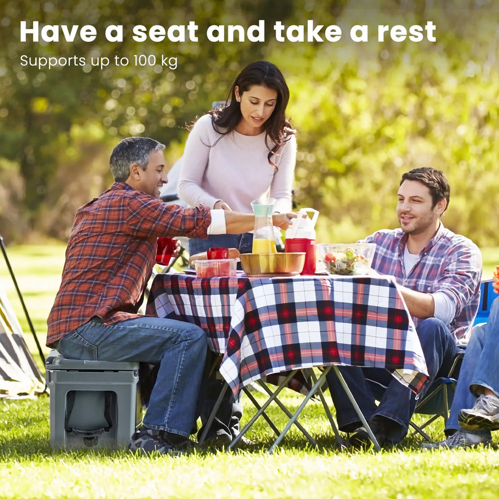 Colour: Charcoal/Tan Materials: LLDPE, Polyurethane, Nylon, Rubber Product Dimension: 60 x 33 x 35 cm (L x W x H) Interior Size: 46 x 24 x 27 (W x D x H) Capacity: 28 L Net Weight: 7 kg Weight Capacity: 100 kg Package Includes: 1 x 28L Cooler 1 x Instruction Manual