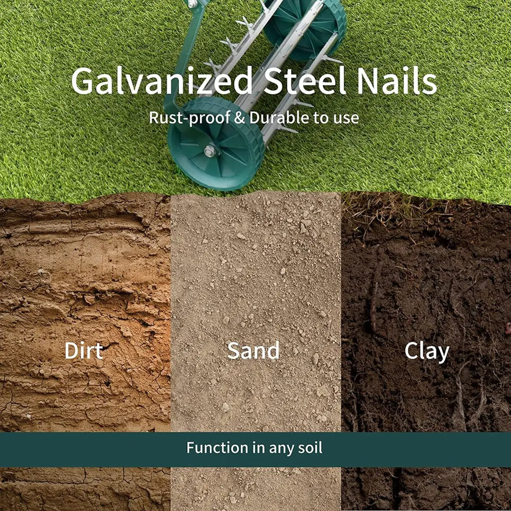 - Efficient aeration: Steel spikes create multiple holes per pass to reduce soil compaction and improve water and nutrient uptake by roots.
