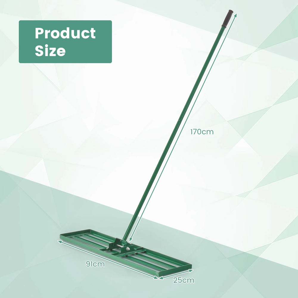 Color: Green Material: Metal, PVC Handle Length: 67" Size: 30 inches Plate Dimension: 30" x 10" (L x W) Net Weight: 12 lbs Size: 36 inches Plate Dimension: 36" x 10" (L x W) Net Weight: 12.5 lbs Size: 42 inches Plate Dimension: 42" x 10" (L x W) Net Weight: 13.5 lbs Package includes: 1 x Lawn Leveling Rake 1 x Instruction