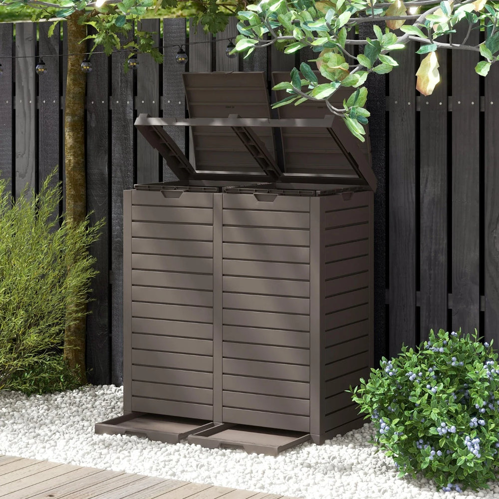62 Gallon Outdoor Trash Can Waterproof Double Bin with Tiered Lid and Drip Tray-Coffee