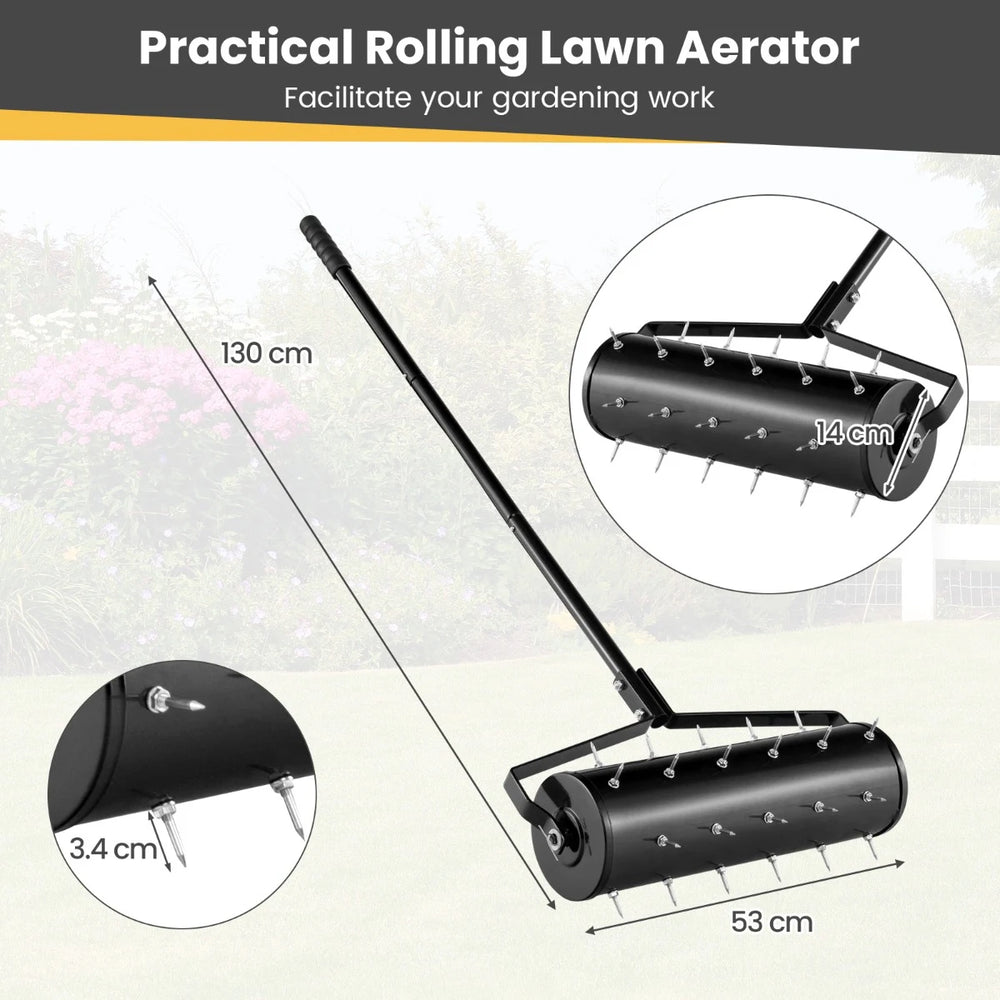 Color: Green Material: Galvanized Steel, Metal, PP Product Size: 18" x 51"/21"x 51"(L x H) Drum Dimension: 5.5” Spike Length: 1.3” Sand Capacity: 5.5L/6.8L Net Weight: 9.5 lbs/11 lbs Package includes: 1 x Rolling Lawn Aerator 1 x Instruction Manual