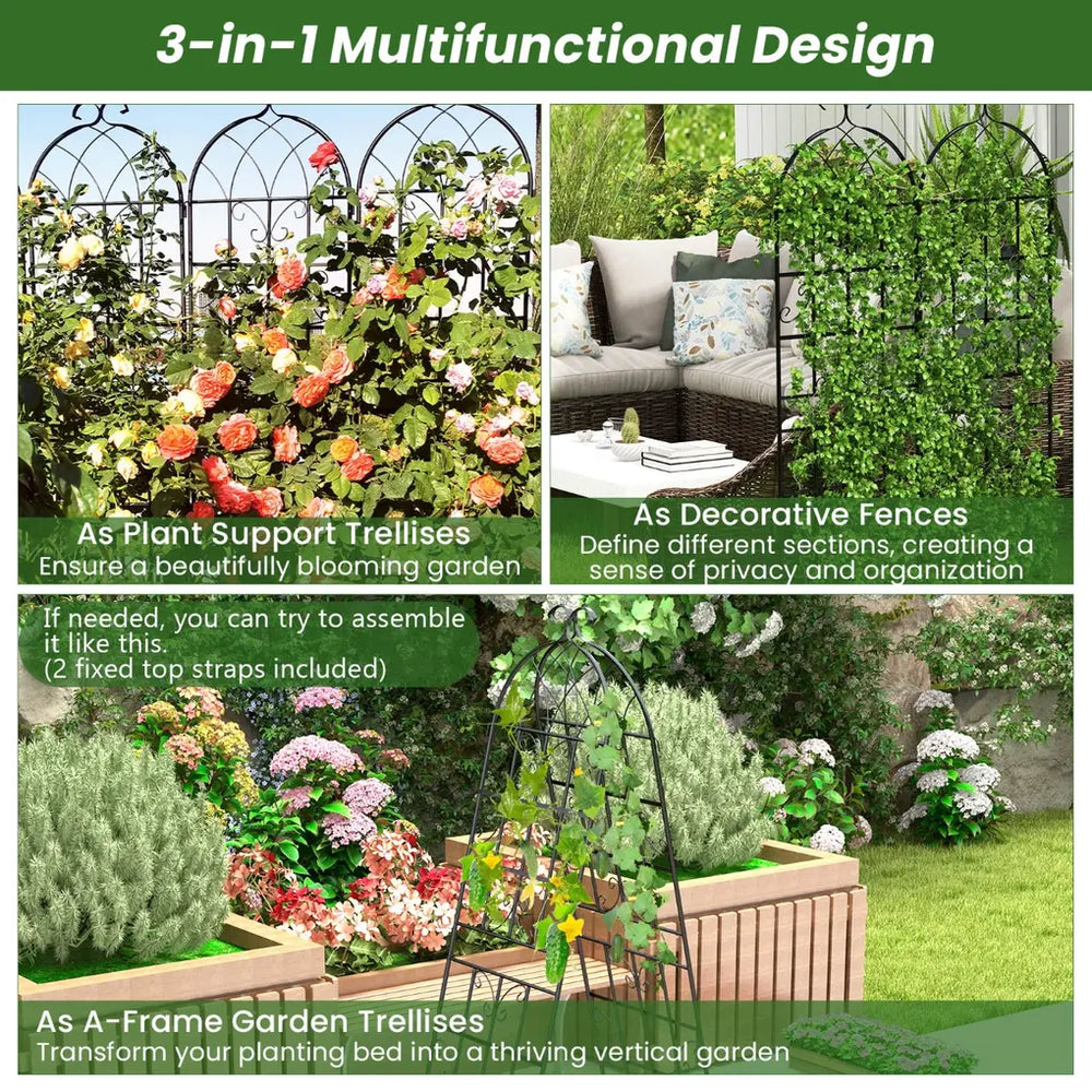 Color: Black Material: Galvanized Steel Single Fence Size: 71" x 20" (L x W) Net Weight: 9 lbs/18 lbs Package includes: 2/4 x Metal Garden Trellis 1 x Instruction