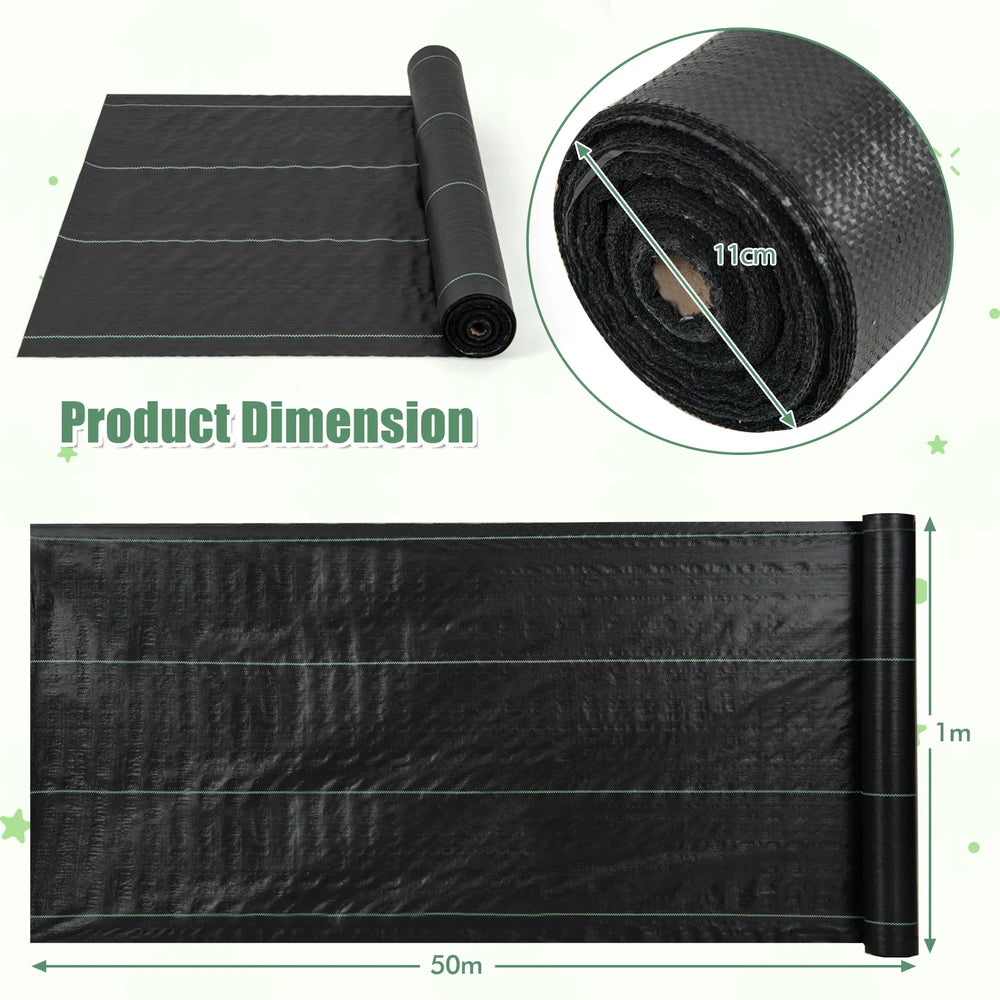 Color: Black Material: PP Overall Dimension: 9cm x 9cm x 100 cm (L x W x H) Unfolding Dimension: 50 m x 1 m(L x W) Net Weight: 3.2 kg Overall Dimension: 9cm x 9cm x 100 cm (L x W x H) Unfolding Dimension: 25 m x 2 m(L x W) Net Weight: 3.2 kg Overall Dimension: 11cm x 11cm x 100 cm (L x W x H) Unfolding Dimension: 50 m x 1 m(L x W) Net Weight: 5 kg Overall Dimension: 11cm x 11cm x 100 cm (L x W x H) Unfolding Dimension: 25 m x 2 m(L x W) Net Weight: 5 kg Package includes: 1 x 50m2 Weed Barrier