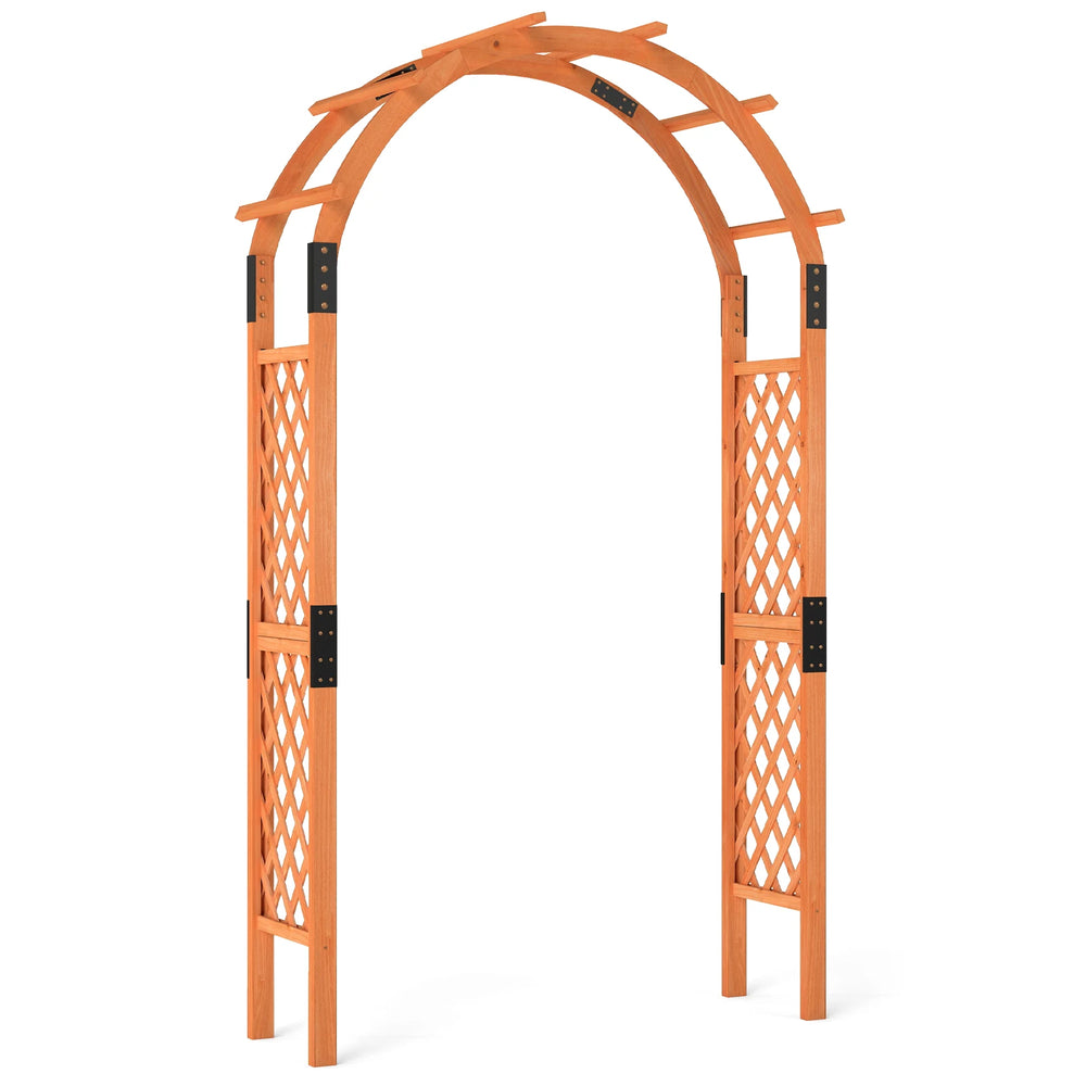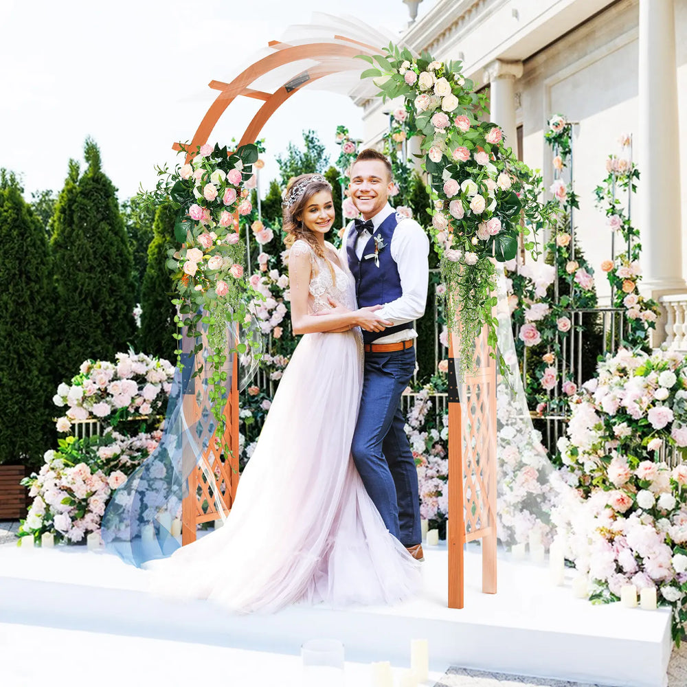 Give your outdoor area a special charm with this trellis arch! Measuring 132 x 45.5 x 235 cm (L x W x H), our wooden garden arch not only serves as a climbing pergola for the garden, allowing for vertical growth, but also as an elegant backdrop for special occasions like weddings and anniversaries, or simply as a unique entrance to your garden or courtyard. It features a curved roof and side trellises that can be adorned with climbing plants or embellished with balloons, decorative lights, or hanging baskets for a personalized touch. Crafted from high-quality fir wood and reinforced with metal connectors, the rose arch provides a sturdy and reliable structure built to last. Transform your outdoor space into a tranquil retreat with our wooden archway, effortlessly combining utility with aesthetics. Attributes: Sturdy and reliable construction: Our product is crafted from natural fir wood and reinforced with solid metal connectors. The wood used is reliable and warp-resistant, built for durability. Furthermore, the wooden surface is finished with water-resistant paint to protect it from the elements. Suitable for various scenes: The garden arch is perfect as an elegant backdrop for various occasions such as anniversaries, outdoor weddings, or garden parties. It not only serves as a decorative element but also provides a unique entrance for your garden or courtyard. Generous space for planting: The gazebo features a vaulted roof and side trellises to support climbing plants and allow them to grow gracefully upwards. It also serves as a charming support for hanging small flower baskets or decorative ornaments. Versatile decoration options: Place this wooden arch in your garden or on your lawn and decorate it by growing climbing plants such as roses, vines or morning glory, or decorate it creatively with colorful balloons, wedding tulle, garlands and LED lights to make it truly your own. Easy Assembly: The solid wood wedding arch measures 132 x 45.5 x 235 cm (L x W x H) and features a simple structure and clear illustrations in the instruction manual, making assembly a breeze. Note: We recommend staking the wooden legs into the ground to ensure stability. Characteristics: Made from sturdy fir wood, known for its excellent durability and warp resistance The wooden surface is coated with waterproof paint and weatherproof The trellises provide climbing plants with sturdy support so they can grow upwards The arched roof allows for hanging flower baskets, lights or other decorative items Versatile, for example as a wedding entrance, terrace entrance or garden pergola for climbing Decorate it with balloons, fresh flowers, wreaths, vines, LED lights and more Equipped with metal connectors to prevent deformation or cracking Made of thick support legs that can be easily inserted into the ground Designed with lattice trellises, it adds a touch of sophistication