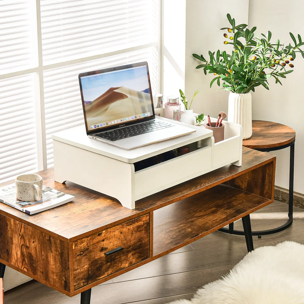 This space-saving countertop vanity table with a flip-top mirror is perfect for your daily makeup! Featuring a large hidden compartment and side open shelf, this makeup table can store and organize most of your cosmetics, jewelry, skin care products, etc. which can keep your desktop clean and tidy. The flip top mirror enables you to use this table as a dressing table or laptop desk conveniently. Besides, the strong pneumatic rod and buffer device makes the mirror flip up and down smoothly and quietly. Made of premium engineered wood and glass, our vanity table ensures excellent stability and long-lasting use. This multifunctional makeup vanity can organize your countertops and is suitable to be used in your bedroom, study room, apartment, or bay window. Bullet Point: Flip Top Mirror for Dual Use: Featuring a flip-top design, the mirror of this countertop vanity table is easy to flip up and down for your daily makeup. And you can put down the mirror to use it as a laptop desk conveniently. The heavy-duty pneumatic rods and anti-bumping devices ensure smooth and silent operation. Sufficient Storage Space: The large hidden compartment beneath the tabletop can store your cosmetics, jewelry, skin-care products, hair accessories, etc and keep them away from dust. Besides, the side open storage area is ideal to place your frequently used lipsticks, sunglasses, combs, perfumes for easy access. Perfect Size & Wide Application: With a compact design and modern style, this lovely countertop makeup table will save plenty of space and is suitable to be placed anywhere in your home, including the bedroom, bay window, study room, etc. The elegant and simple style makes the table a perfect addition to your room. Premium Material & Thoughtful Details: Made of thick and durable engineered wood, this makeup storage cabinet is durable, wear-resistant and not easy to deform. The mirror made of high quality glass has clear reflection and strong hardness for longtime use. In addition, the round corners and smooth edges are designed for safe use. Easy to Assemble & Clean: Coming with complete accessories and detailed instruction, this flip top dressing table is easy to assemble. And you can finish the assembly work in a short time. What's more, the smooth surface with premium melamine finish is easy to clean just with damp cloth. Features: Flip-top mirror is great for you to check your makeup and hairstyle Heavy duty pneumatic rod ensures smooth and silent lifting up/down High quality engineered wood ensures great stability and durability A large hidden compartment beneath the top for dust-free storage The side open compartment perfectly stores your often-used items Spacious tabletop allows you to put your laptop, cup, magazine, etc Premium metal hinge and buffer device reduce noise and avoid bumping Can be placed on the dresser, writing desk, office desk to use Suitable for the bedroom, closet, living room, study room and more Smooth and waterproof surface is easy to clean with damp cloth Complete hardware and clear instruction for easy assembly Specifications: Colour: White Material: Engineered Wood, Glass Product Dimension:60 cm x 40 cm x 18 cm Mirror Size:34.5 cm x 34.5 cm Net Weight: 8.7 kg Package Includes: 1 X Countertop Vanity Dresser 1 X Instruction
