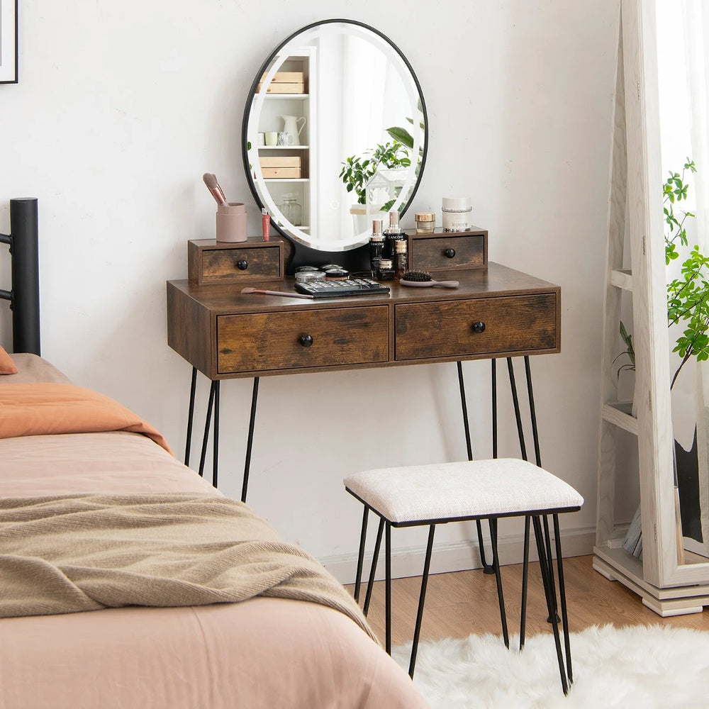 Vanity Table Set with 3-Color Lighted Dimmable Mirror-Rustic Brown