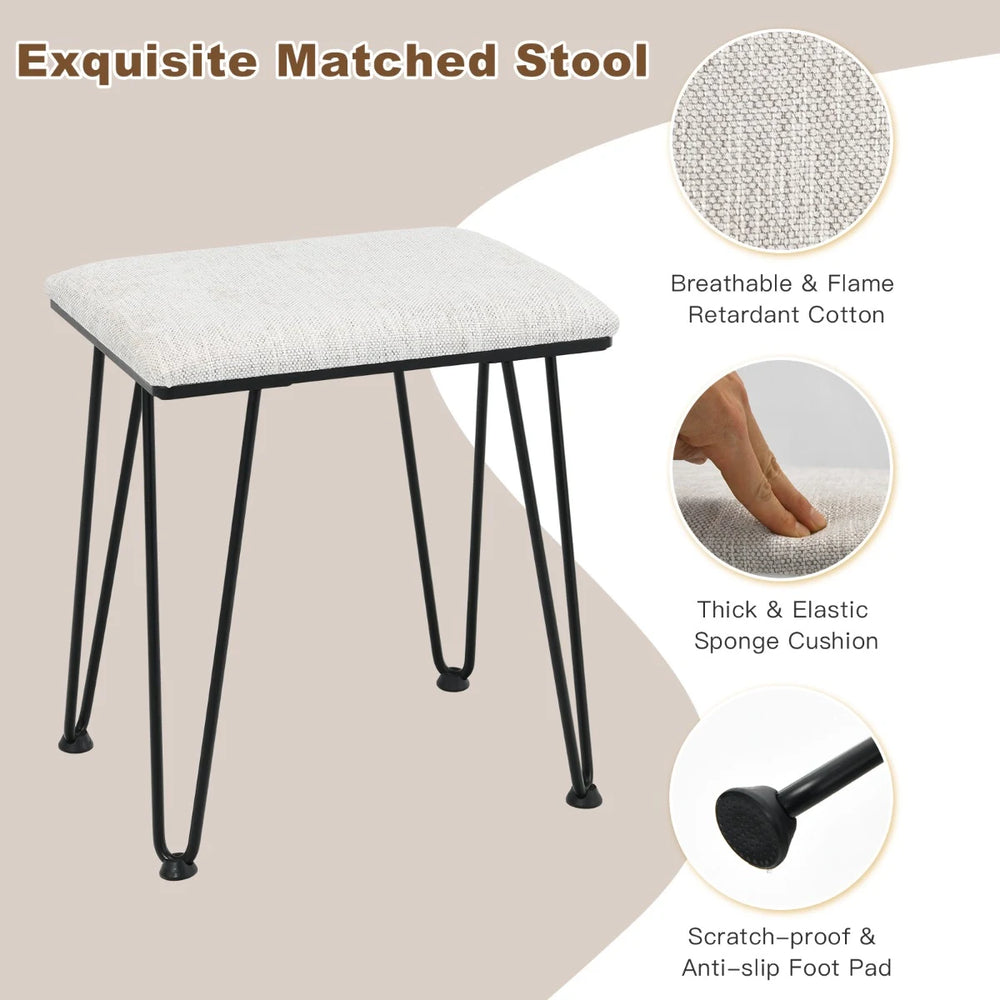 Colour: White + Golden/Rustic Brown + Black Material: MDF, Steel, Fabric Linen, Sponge, Glass Dimension of Table: 80 x 40 x 135 cm (L x W x H) Dimension of Stool: 40 x 30 x 45 cm (L x W x H) Mirror Size: 54 x 45 cm (L x W) Height of Tabletop: 76 cm Net Weight: 28 kg Weight Capacity of Each Drawer: 5 kg Weight Capacity of Table: 90 kg Weight Capacity of Stool: 100 kg Package includes: 1 X Vanity Table 1 X Stool 1 X Adaptor 1 X Manual