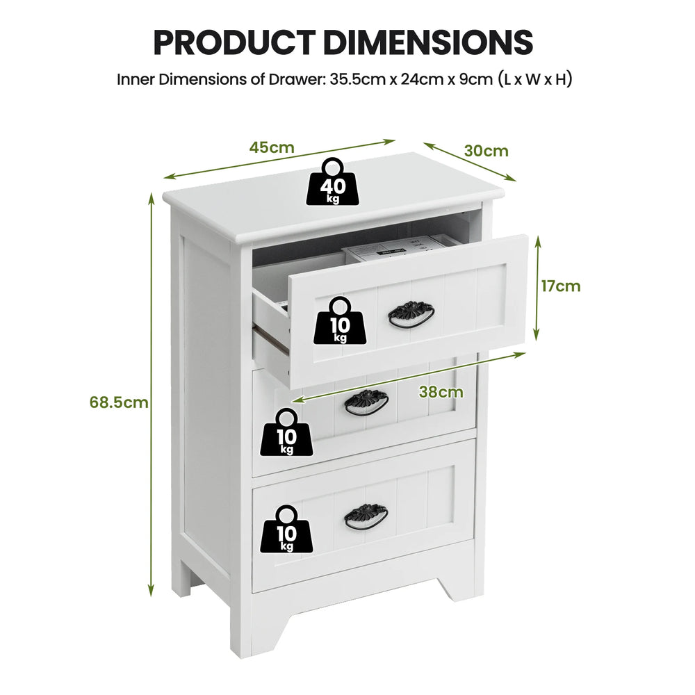 This three-drawer bedside table blends vintage style with practical storage. Made from painted P2 MDF, the unit offers a smooth, paint-coated surface that resists everyday splashes and is easy to wipe clean. Elegant metal handles and sleek lines lend a retro look that complements bedrooms, living rooms or studies.