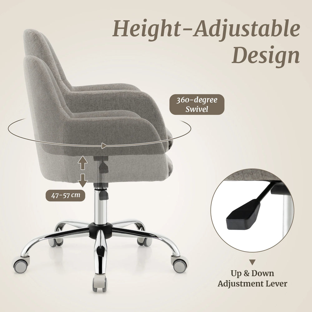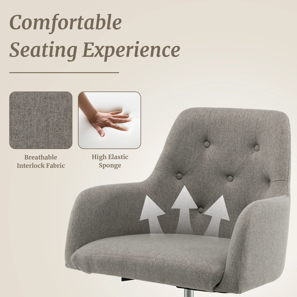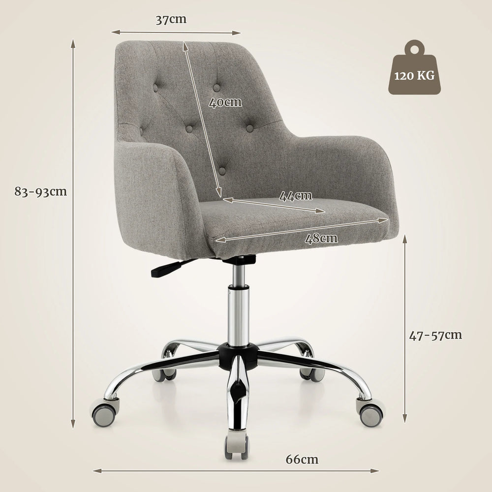 Our tufted office chair is an ideal choice for you or your family to work, study or do makeup. It has an up and down adjustment lever to control its height within a 10cm adjustment range. Plus, with the smooth swivel system, you can rotate the seat as you like and talk freely to friends from all directions. Ergonomic backrest, sponge-padded cushion and curved armrests make sitting or leaning super comfortable. In addition, this home office chair can be easily moved with the help of 5 durable wheels. You can use it in the living room, bedroom, parlor, office or study for various purposes. In addition, it is easy to assemble and maintain. Attributes: ADJUSTABLE AND SWIVEL FUNCTIONS: Thanks to its height-adjustable design, you can adjust the seat height from 47 to 57 cm to your own height with an up and down adjustment lever. Also, our office chair features a premium 360-degree swivel system, so you can freely communicate with friends in any direction. Comfortable Seating Experience: Our desk chair is covered with breathable interlock fabric, which is skin-friendly and comfortable. The 9cm thick padded cushion is filled with high resilience sponge for excellent support and comfort. So you will not feel uncomfortable when sitting or leaning on our chair. And ergonomic armrests give you a place to rest your arms or hands. Flexible Casters for Easy Moving: Our swivel work chair is equipped with 5 flexible and non-slip casters for smooth rolling, ensuring low noise and excellent wear resistance. Therefore, you can move our chair from one place to another effortlessly and won't disturb others. Wide range of applications: With its stylish tufted design and elegant style, our office chair can add a touch of texture to any room in your home and goes well with any room style. You can place it in the living room, bedroom, office or study for various seated activities. Easy to Assemble and Maintain: Coming with a clear instruction manual and all necessary accessories, this chair can be quickly assembled in minutes, saving you time and energy. Its finished dimensions are 66 cm x 66 cm x 83-93 cm (L x W x H) and the chair can withstand a weight of up to 120 kg. Its smooth metal base guarantees easy maintenance. Characteristics: Up and down adjustment lever for convenient chair height adjustment 360 degree rotation system allows children to rotate the seat without moving Breathable interlock fabric and high-density sponge for a comfortable fit Ergonomic backrest and curved armrests fit your body curve and relieve your fatigue 5 flexible and wear-resistant wheels for easy movement Stylish tufted design and elegant style make the chair attractive Perfect for living room, bedroom, office or study Easy assembly with detailed operating instructions and all necessary accessories