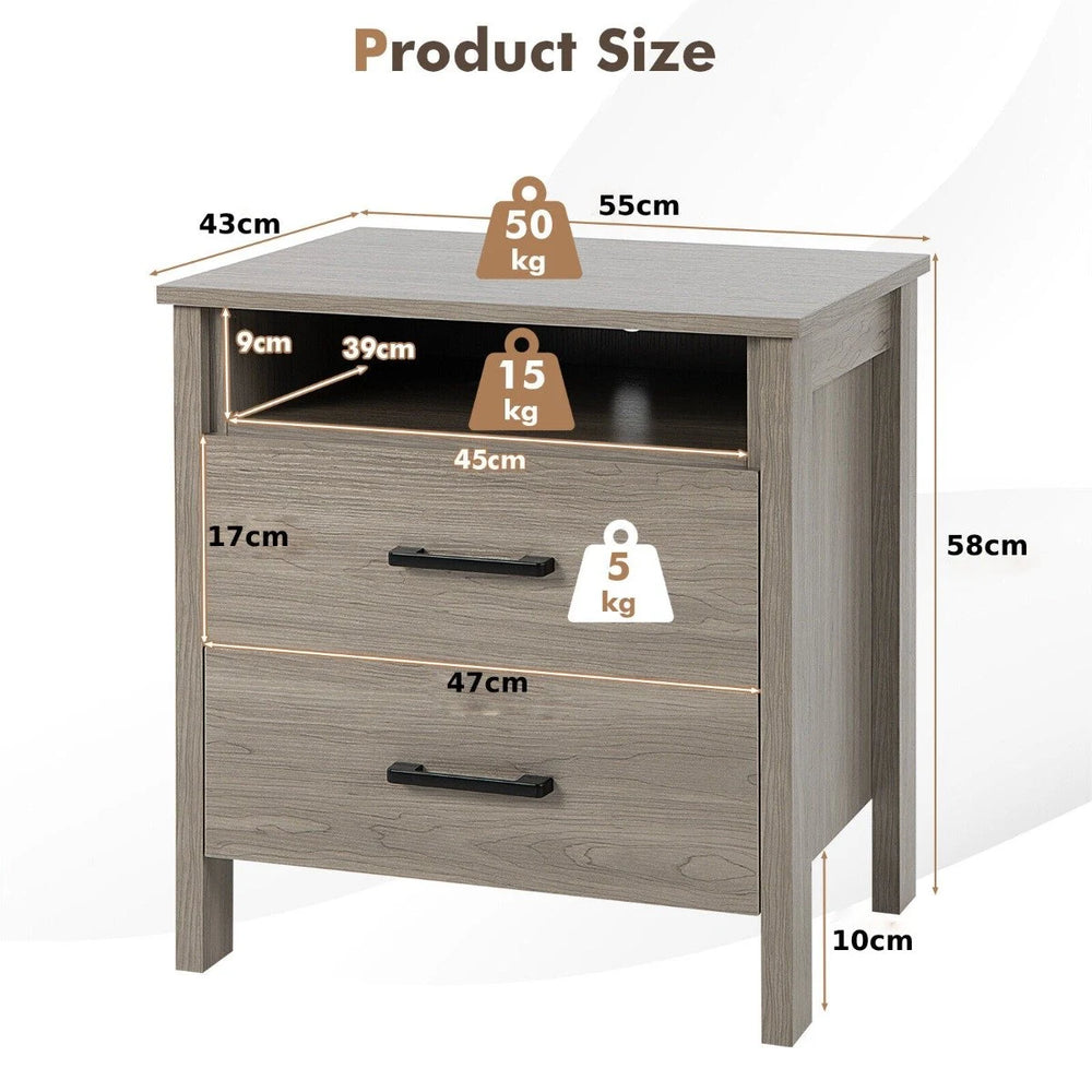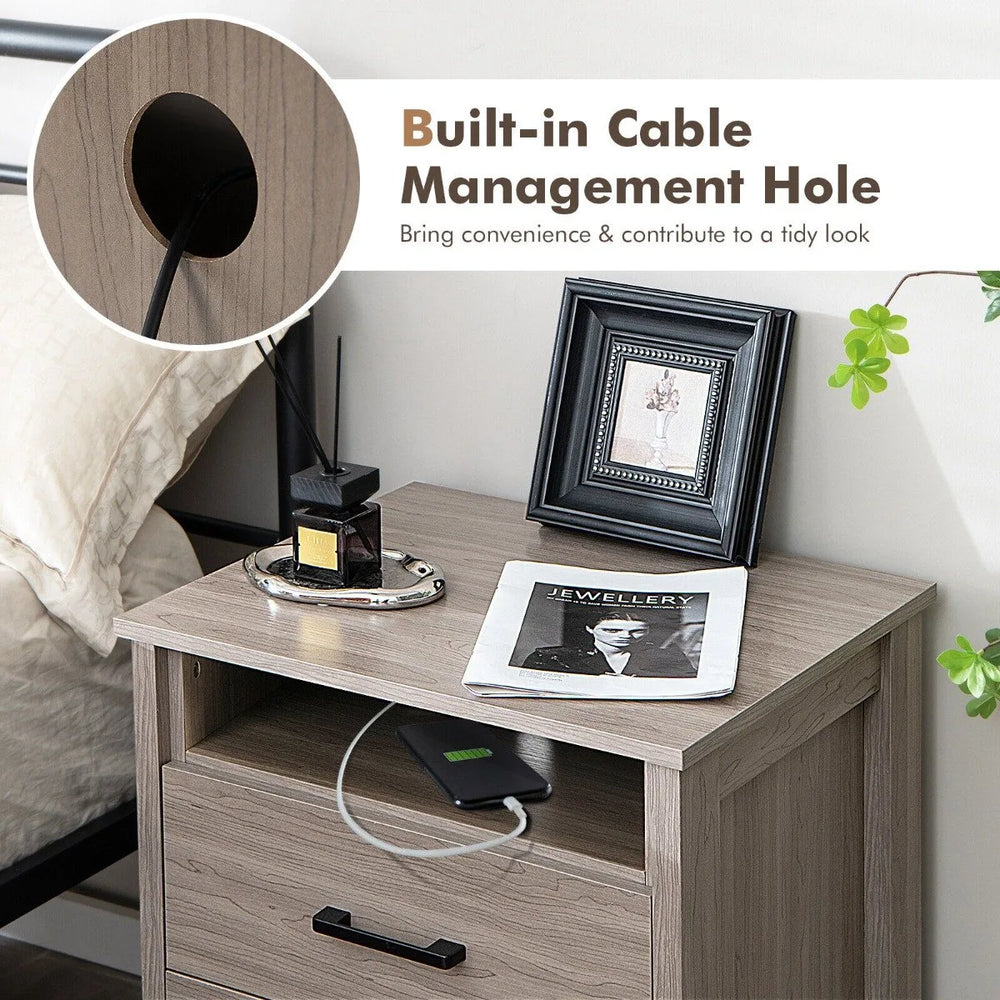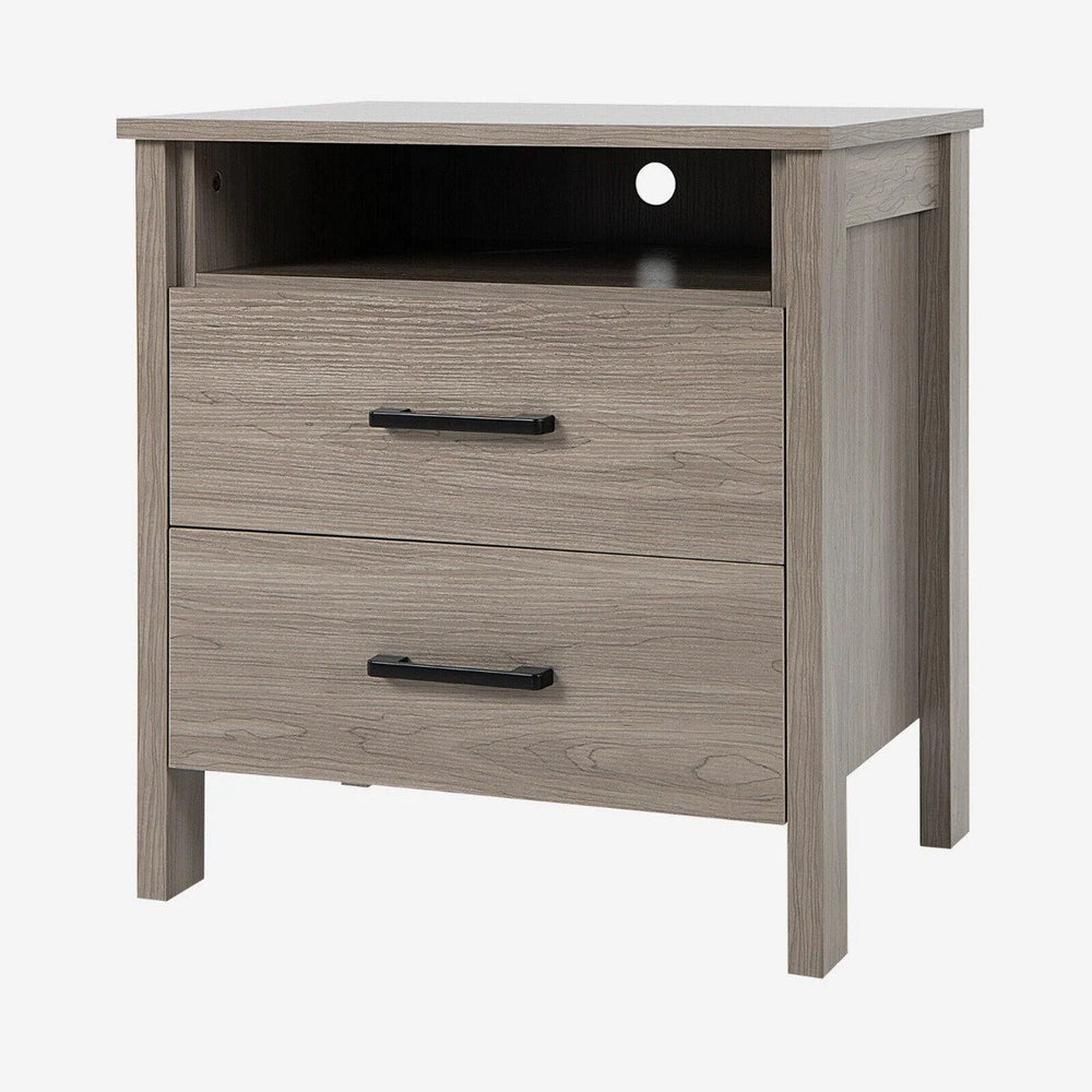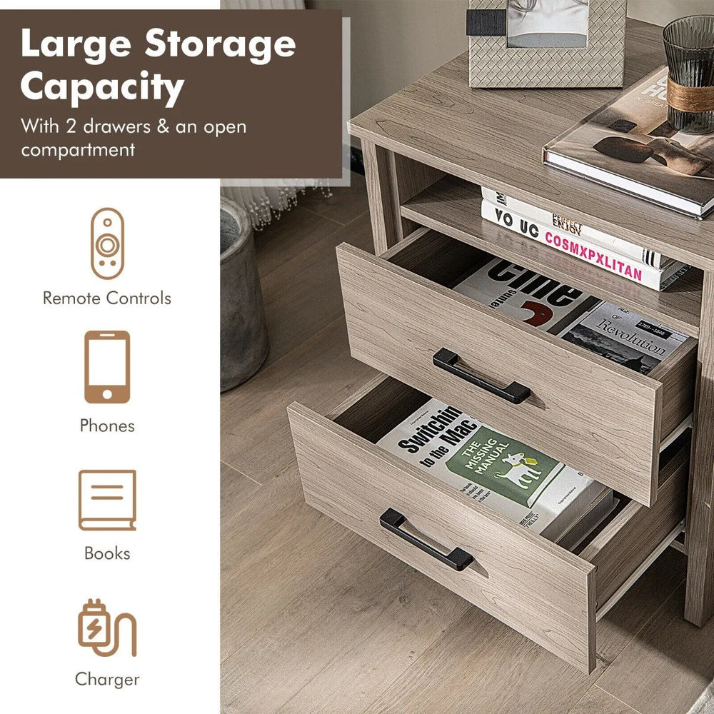 Modern Wood Grain Nightstand with Cable Hole & Open Compartment & 2 Drawers-Natural
