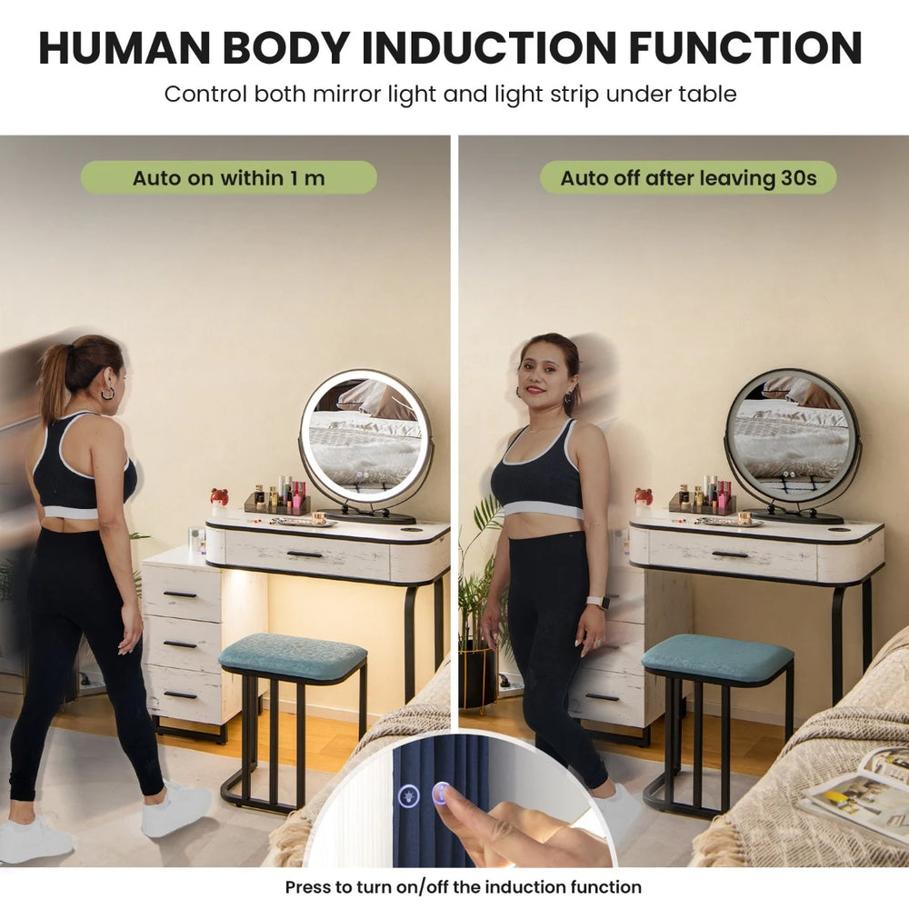 Vanity Table and Stool Set with 3-Color Touch Screen Lighted Swivel Mirror-White