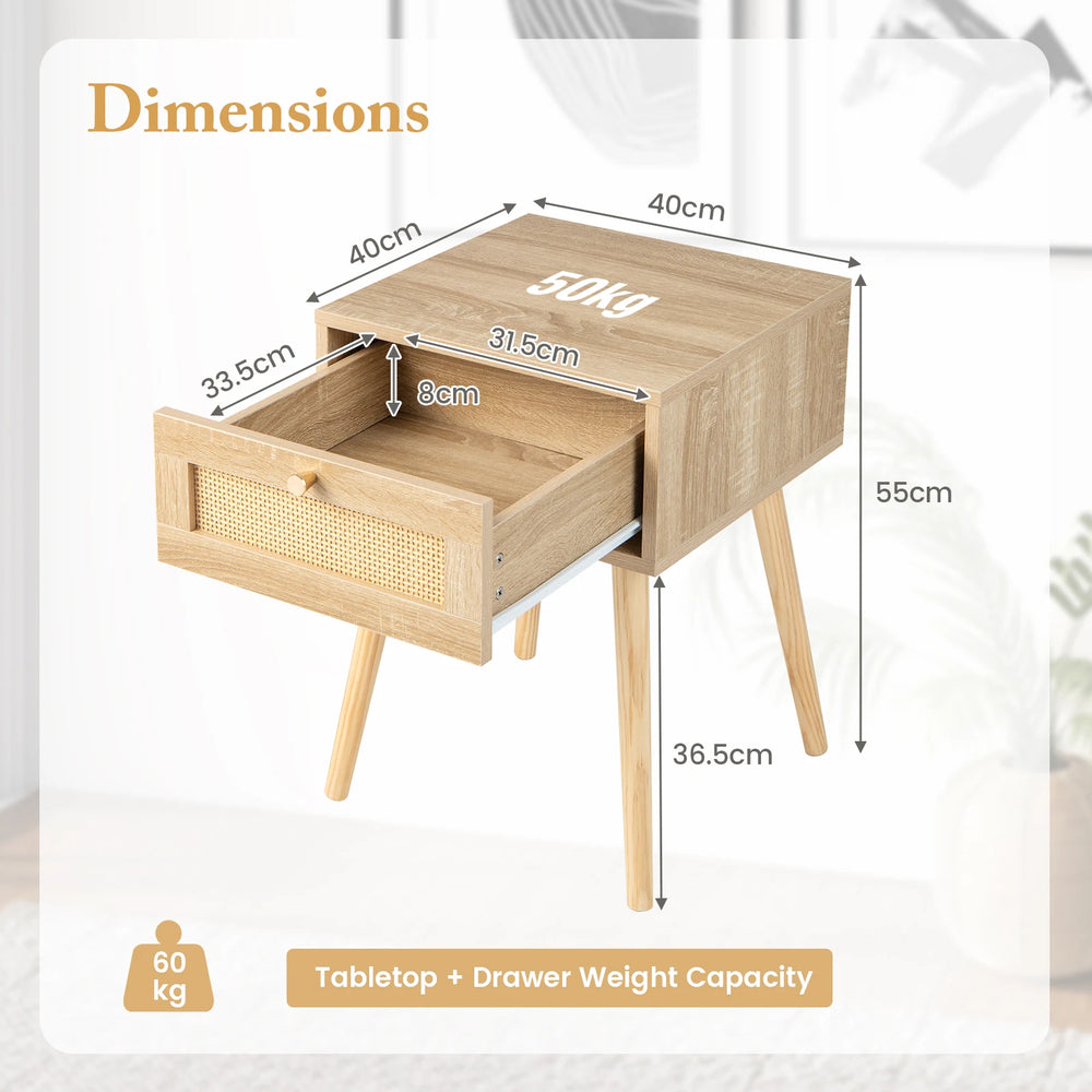 Technical data: Color: Natural Material: MDF, solid wood, plastic rattan Overall dimensions: 40 x 40 x 55 cm (L x W x H) Drawer dimensions: 31.5 x 33.5 x 8 cm (L x W x H) leg height: 36.5 cm Weight capacity of table top + drawer: 60 kg Weight capacity of the table top: 50 kg Net weight: 8 kg Scope of delivery: 2 x bedside table 1 x instruction manual
