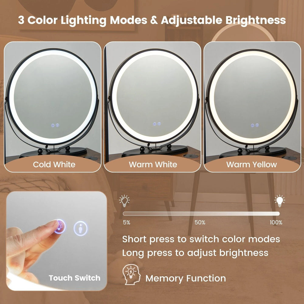 This brown vanity table set brings a professional makeup station into your home with a 3‑colour LED round mirror, stepless brightness control and a 360° swivel head. Thoughtful features such as memory function and human sensing make daily routines quicker and more intuitive, while the removable top mirror lets the desk double as a laptop workspace.