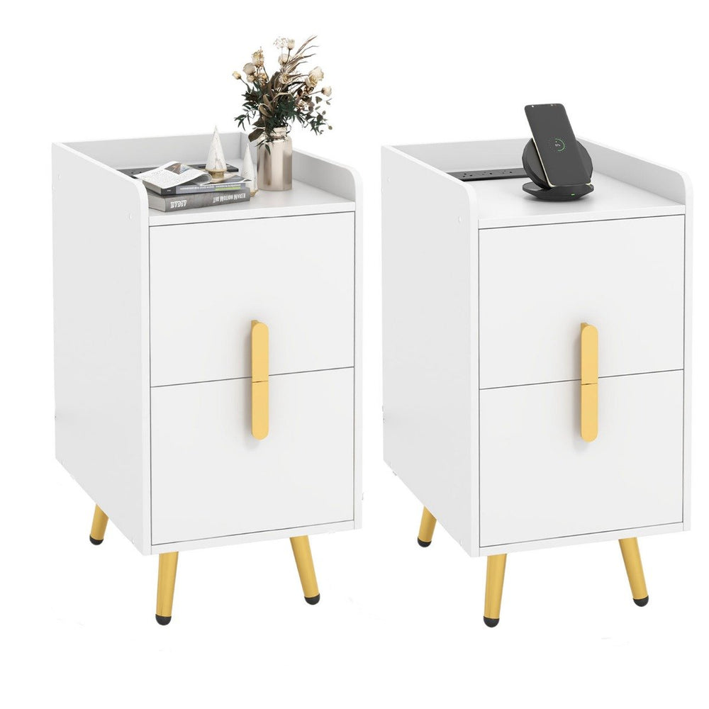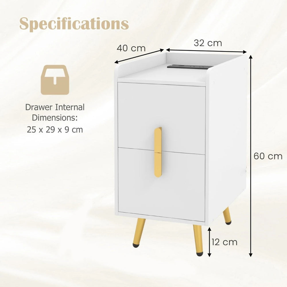 Home Bedside Sofa Side Tables with 2 Drawers and Heavy-duty Metal Legs Support-White