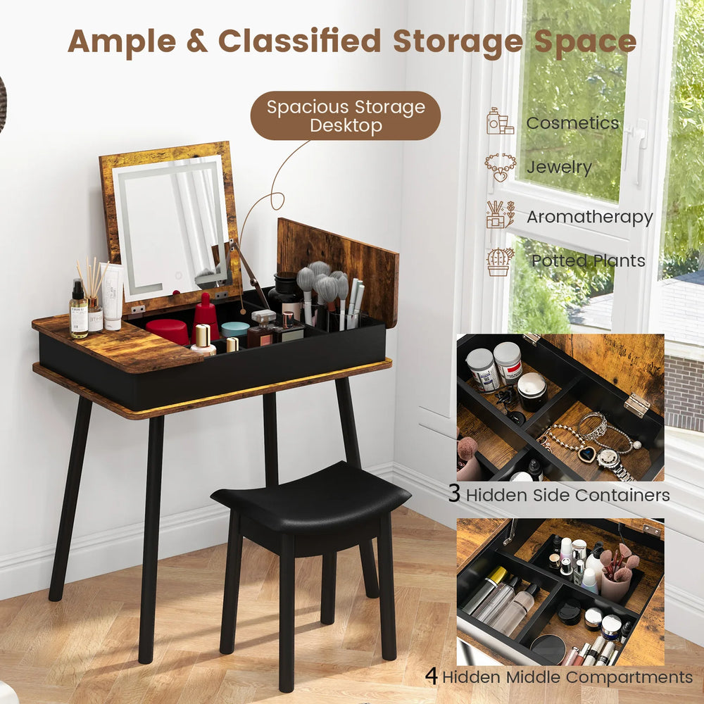 Makeup Vanity Set with Flip-top Mirror and Cushioned Stool-Rustic Brown