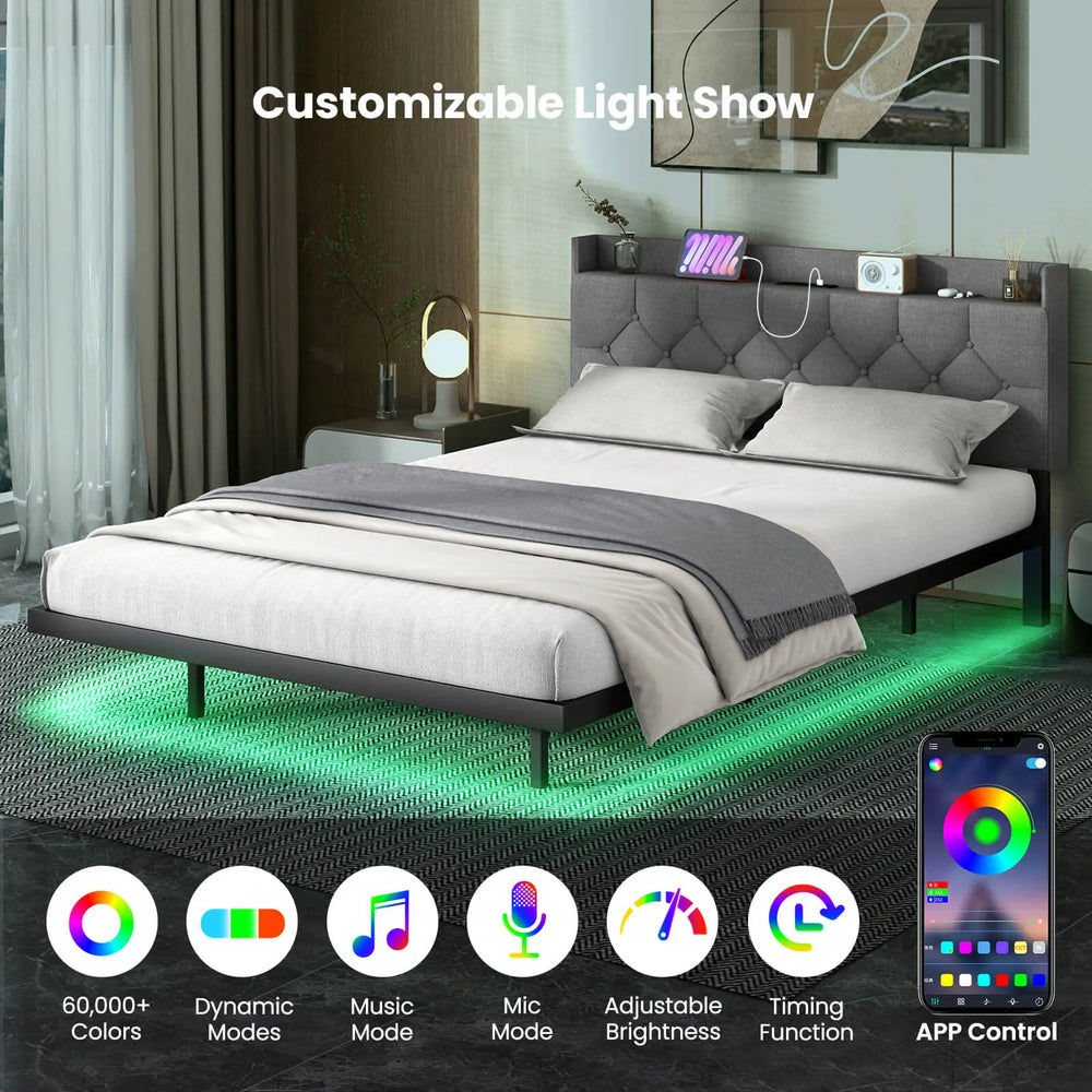 Double/King Size Floating Bed Frame with Adjustable Headboard and Charging Station-Grey-Double Size