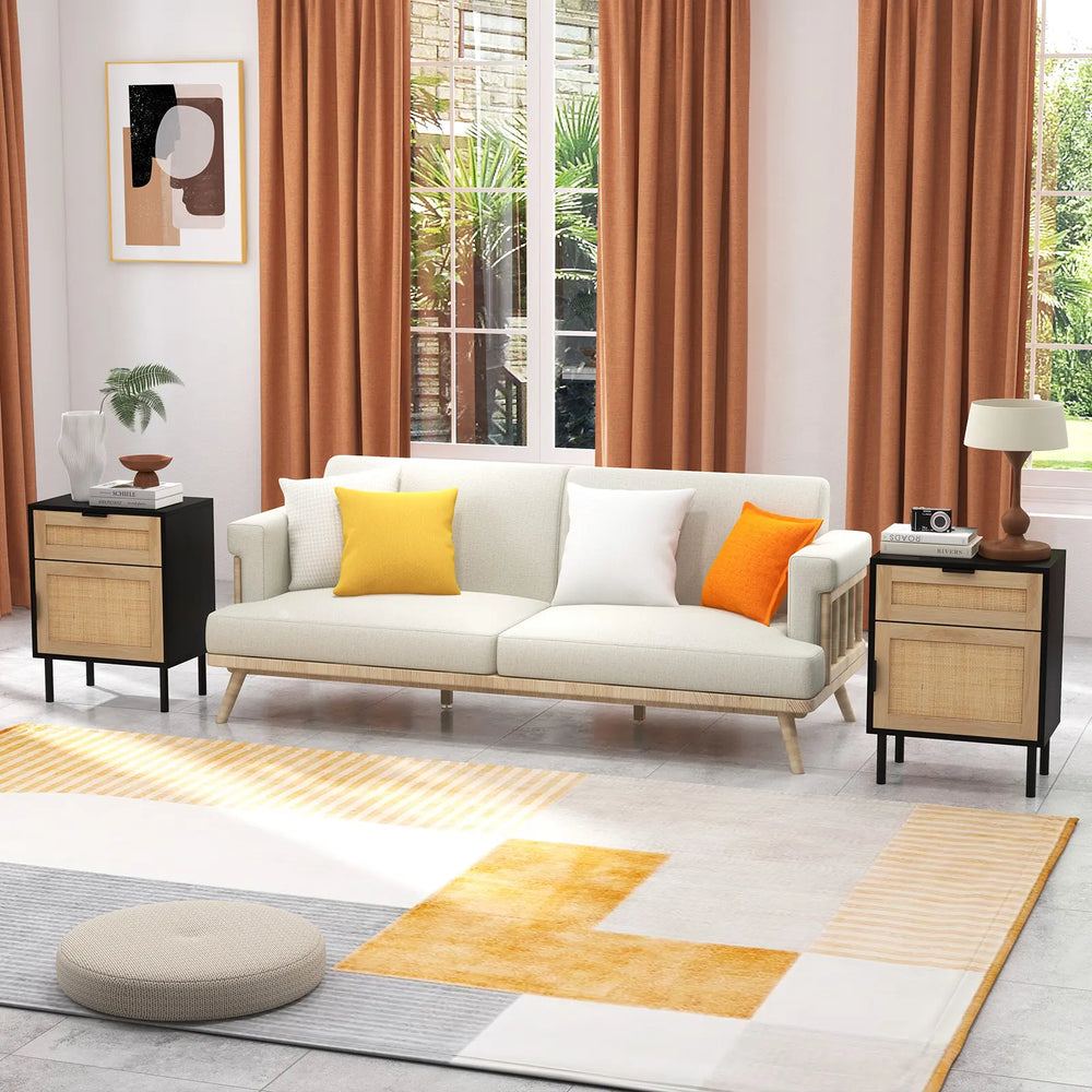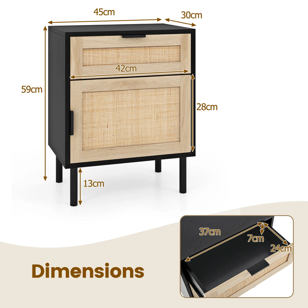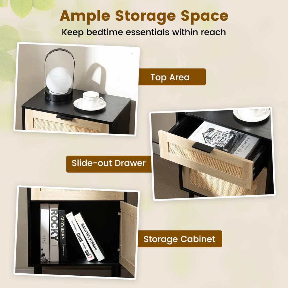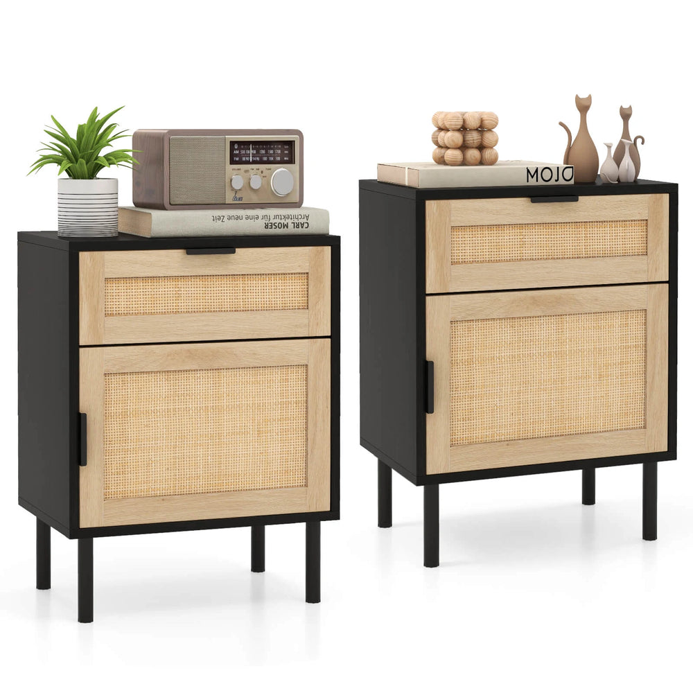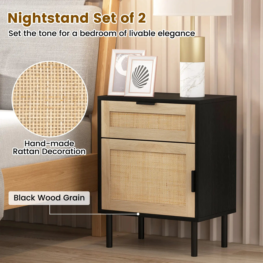 Mid Century Modern Rattan Nightstand Set of 2 with Drawer and Cabinet-Black