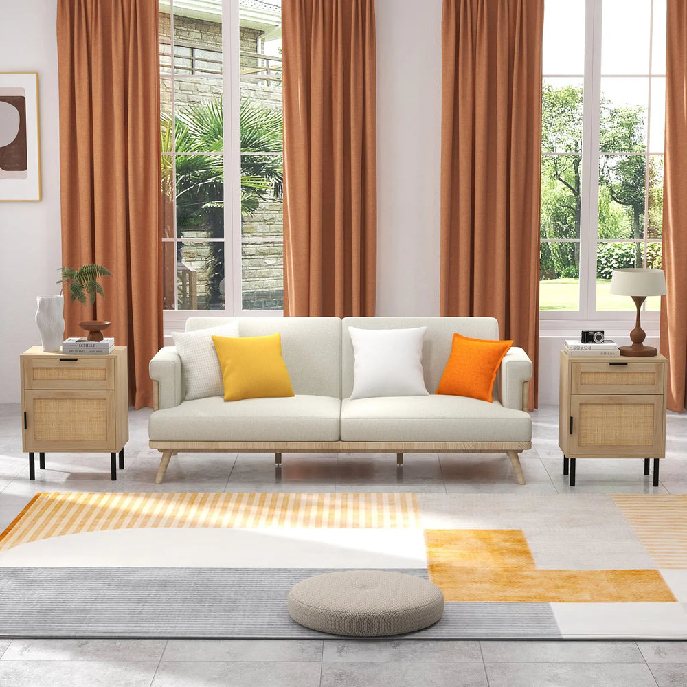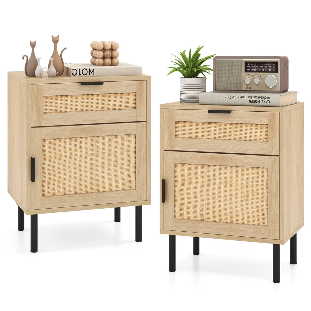 Set of 2 Rattan Nightstand with Drawer and Cabinet and Metal Legs-Natural