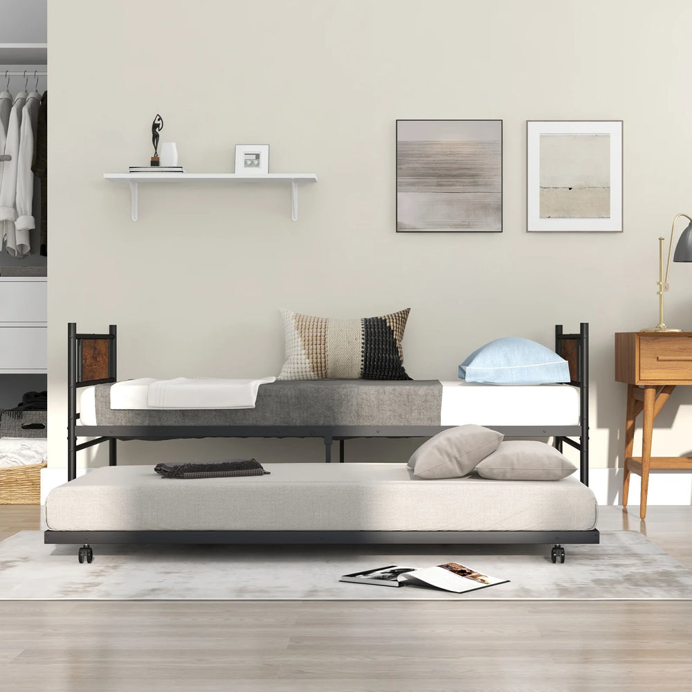 Metal Daybed with Pull-out Trundle Sofa Guest Bed with Wheels-Single Size