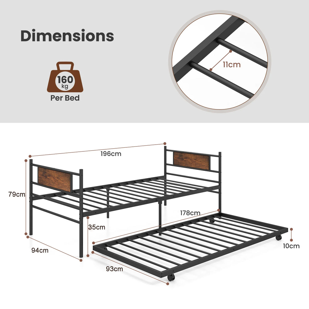 Colour: Rustic Brown Material: Metal, Engineered Wood Overall Dimensions: 196 x 94 x 79 cm (L x W x H) Trundle Bed Dimensions: 178 x 89 cm (L x W H) Daybed Mattress Recommendation: 190 x 90 cm (L x W) Weight Capacity Per Bed: 160 kg Net Weight: 26 kg Package Includes: 1 x Daybed with Trundle 1 x Instruction