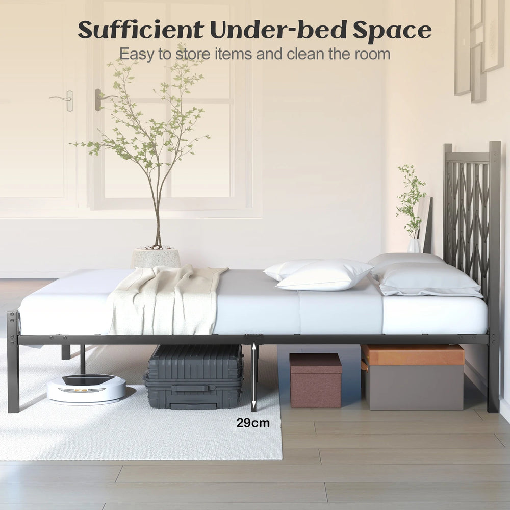 Color Black Material Metal (Twin-Size) Overall Dimension 78" x 40" x 43.5" Height of Footboard 16.5" Height of Under-bed Space 11.5" Recommended Mattress Thickness(Not Included) 8"-10" Net Weight 46 lbs Weight Capacity 620 lbs (Full-Size) Overall Dimension 78" x 55" x 43.5" Height of Footboard 16.5" Height of Under-bed Space 11.5" Recommended Mattress Thickness(Not Included) 8"-10" (Not Included) Net Weight 59 lbs Weight Capacity 660 lbs (Queen-Size) Overall Dimension 83" x 61" x 43.5" Height of Footboard 16.5" Height of Under-bed Space 11.5" Recommended Mattress Thickness(Not Included) 8"-10" (Not Included) Net Weight 62.5 lbs Weight Capacity 800 lbs