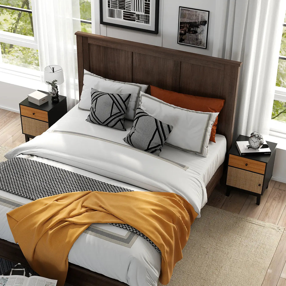 Boho Rattan Nightstand Bedside Table with Solid Wood Legs-Black