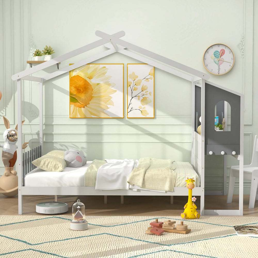 Single/Double House Bed Wood Montessori Bed Frame with Desk-Double Size