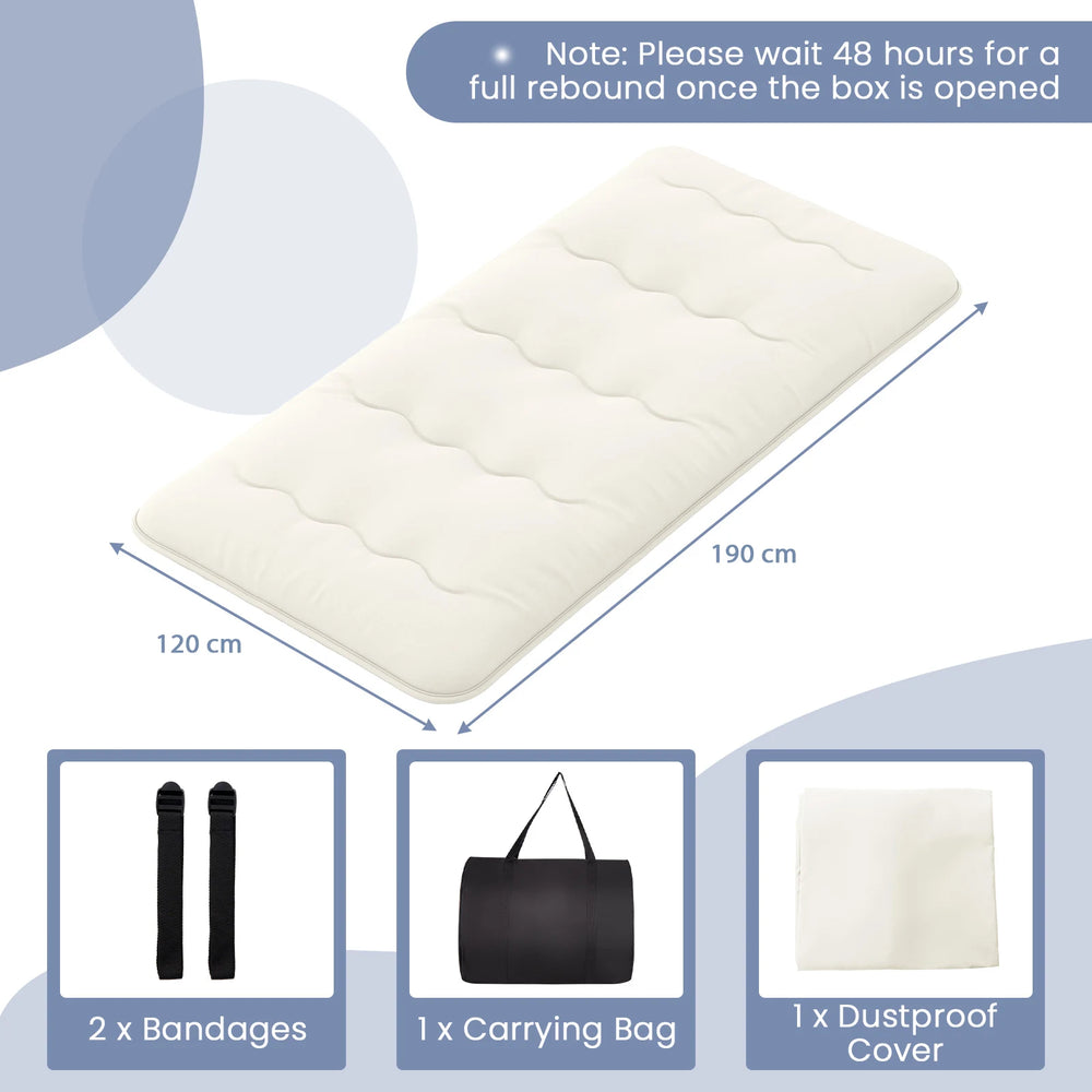 Color: Beige/Black/Gray/Navy Material: Polyester Fabric + Sponge Compact Double Overall Dimension: 190 x 120 x 10 cm (L x W x H) Net Weight: 4.5 kg Double Overall Dimension: 190 x 135 x 10 cm (L x W x H) Net Weight: 6 kg King Overall Dimension: 200 x 150 x 10 cm (L x W x H) Net Weight: 6.5 kg Package Includes: 1 x Mattress 2 x Bandages 1 x Carry Bag 1 x Dustproof Cover