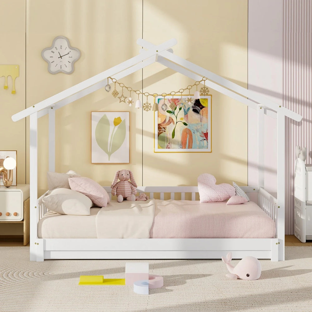 Single to Double Daybed with Safety Guardrail and Roof Frame1-White-Twin size