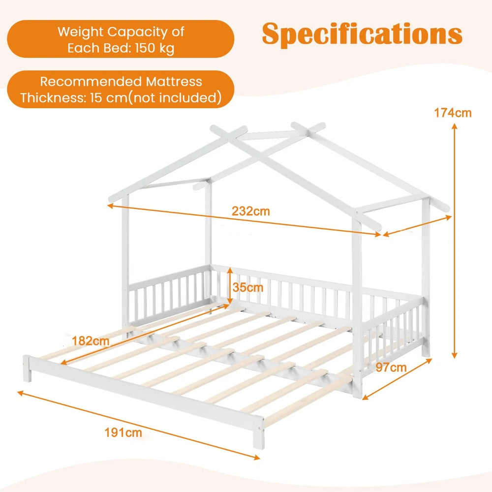 Colour: White Material: Pine Wood, Plywood Overall Dimensions: 232 x 97 x 174 cm (L x W x H) Bed Platform Size(Single): 191 x 95 x 17 cm (L x W x H) Bed Platform Size (Expanded): 191 x 182 x 17 cm (L x W x H) Guardrail Height: 35 cm Maximum Weight of Each Single Bed: 150 kg Net Weight: 31 kg Package Includes: 1 x Extendable House Bed Frame 1 x Instruction Manual
